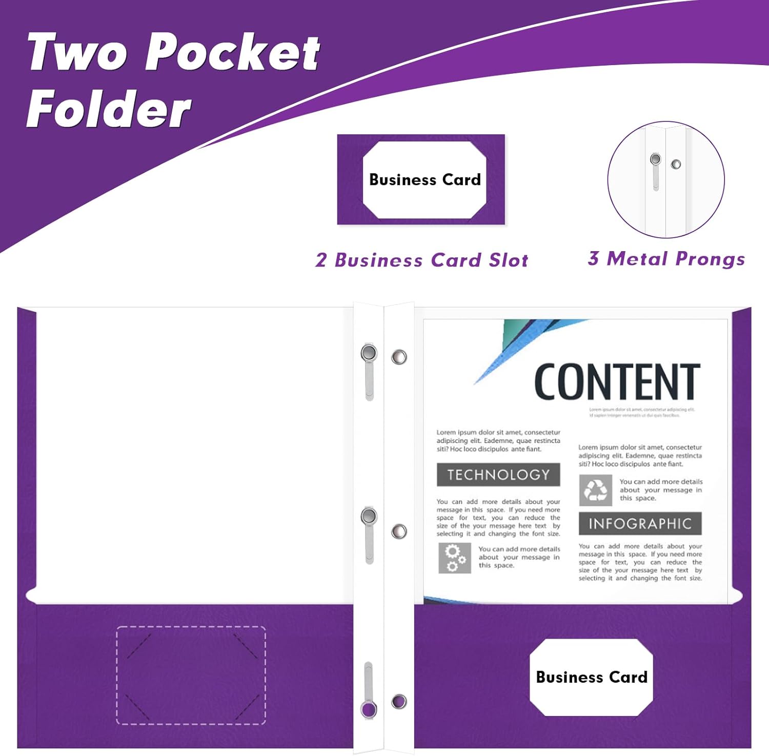 - Two Pocket Folder With Prong: Featuring two spacious pockets and 3 metal prongs. The prongs ensures that your important paper stay securely in place. Two card slot also greatly facilitate the storage of business cards