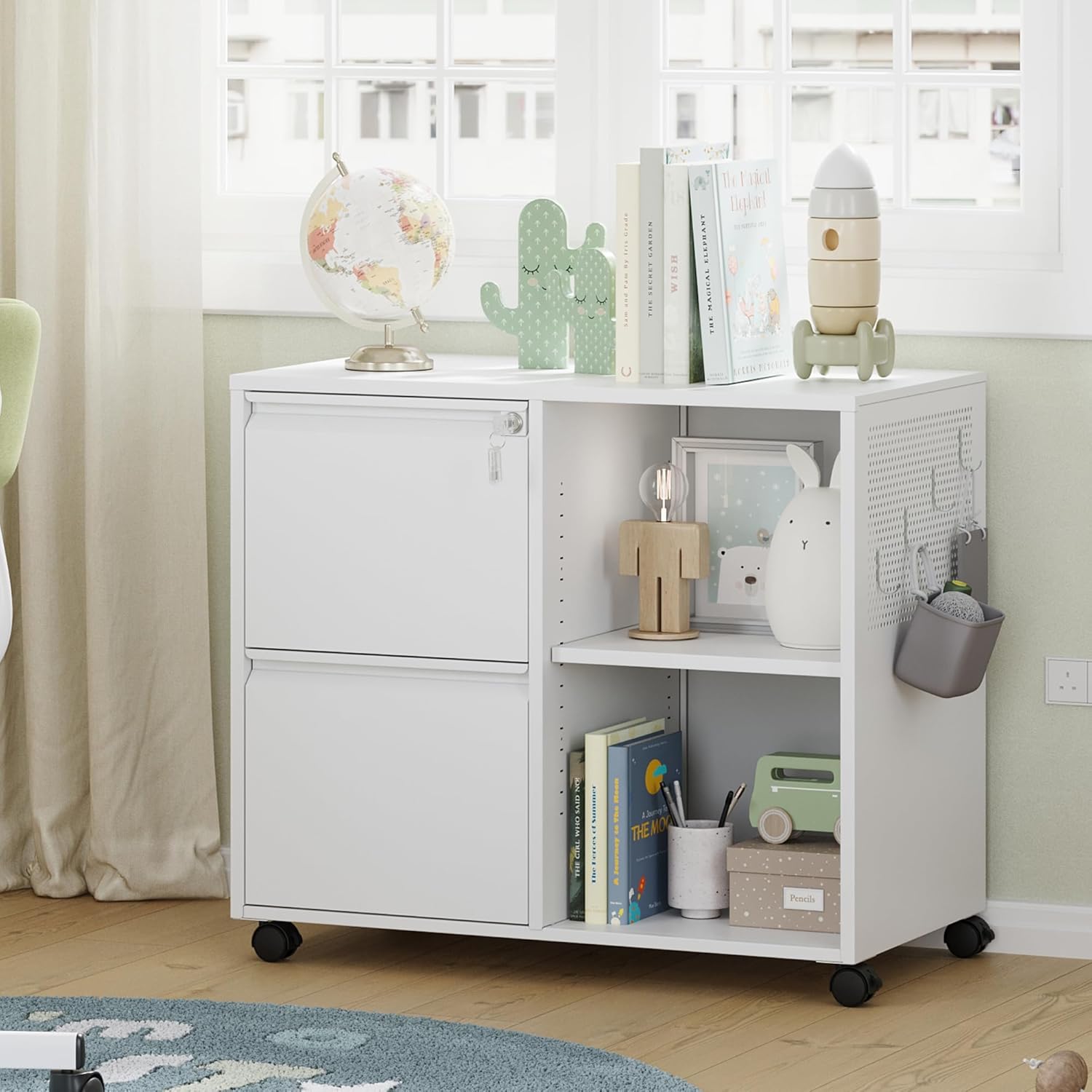 - ăMultifunctional Filing CabinetăLateral filing cabinet with open storage spaces, organization and storage drawers,holds printer stand and office craft storage,side hole panel design is beautiful and can hang items,modern delicate appearance ornamental to your office & home.