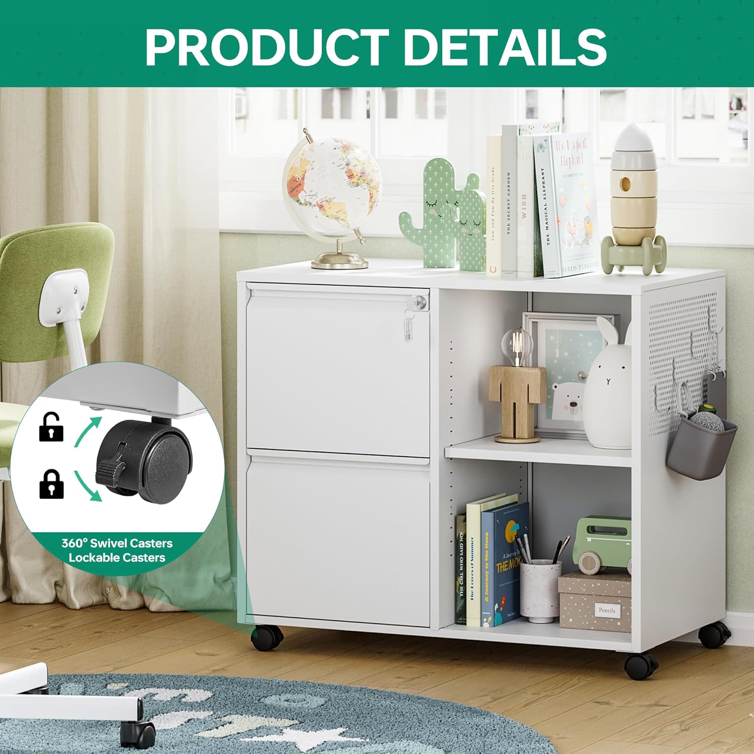 - ăEasy to moveă4 removable wheels- printer stand can be moved and adjusted in position freely,2 wheels lockable to keep cabinet stableïŒDrawer with lock ensure the safety of items.