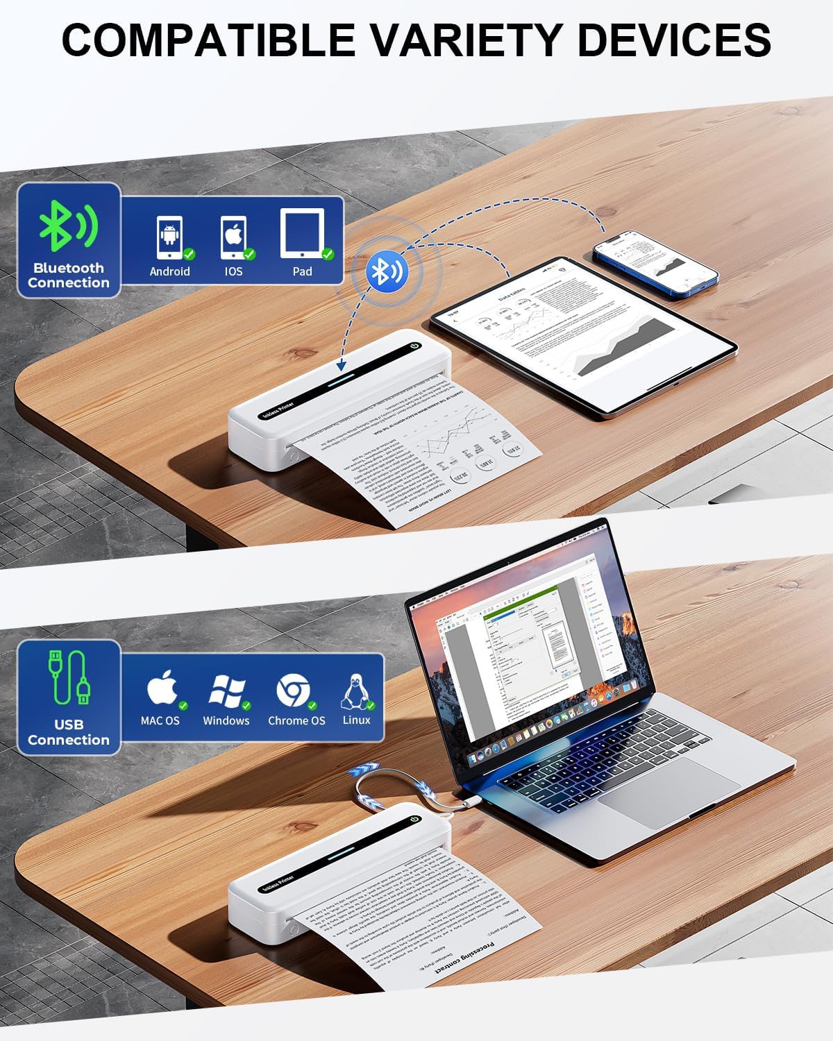 - DEVICE-FRIENDLY PRINTING: Go wireless! Print wirelessly from your phone or tablet via Bluetooth. The wireless bluetooth printer works with iOS, Android. For computers, plug in the USB. Compatible with Windows, Mac, Linux, Chrome, and Win ARM systems. Easy printing for everyone!