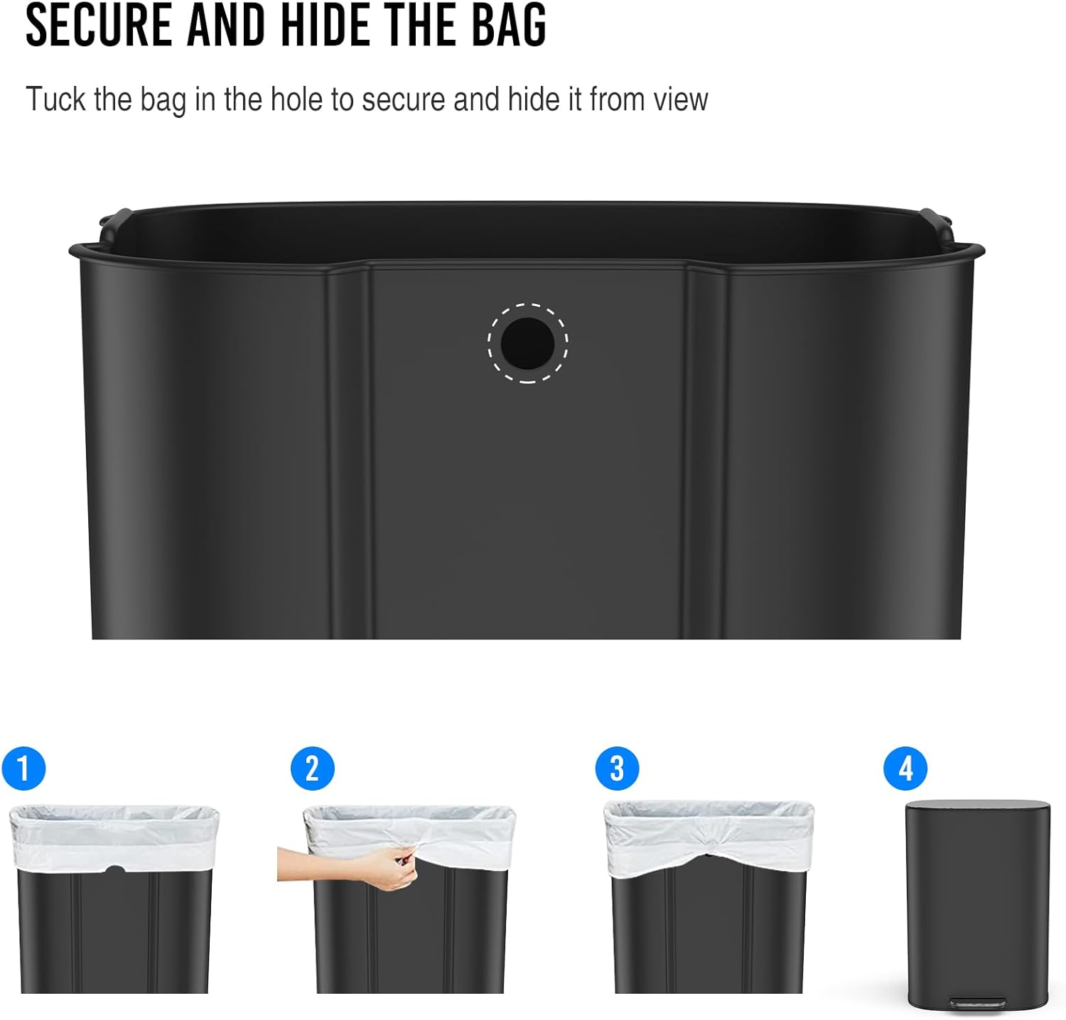 - LARGE CAPACITY TRASH CAN: 12.2''LĂ17.7''WĂ24.8''H, 13.2 gallon(Please Note: Due to the curved angle edges of the box, manual measurements may have a slight error, and the actual size may be slightly larger). The huge capacity definitely meets your daily use, this can fits most brands of 13 gallon trash bags. It can be a good helper for your kitchen & make your room clean and tidy. The sophisticated oval appearance also makes it suitable for a variety of occasions.