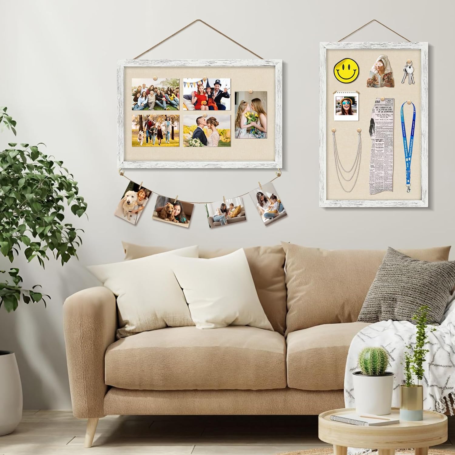 Egofine Cork Board Bulletin Board with Linen, 16x11 Wood Frame Pin Board, 2 Pack Cork Boards for Walls, Vision Board Hanging horizontal or Vertically for Office Home Decor School Kitchen, Rustic White