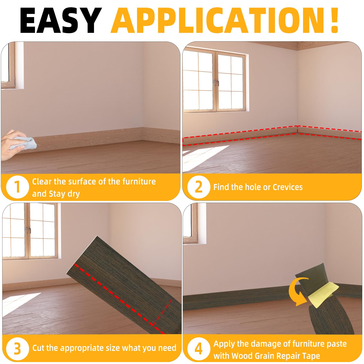 - √【HIGH QUALITY】- The Wood Grain Repair Tape is made of high quality Self Adhesive, which is durable and elastic, with a smooth surface and not easy to be dirty.When you repair Tables, Chairs, Baseboards, Doors, Windows, Floors, All Kinds of Furniture Renovation, Wood Grain Repair Tape will be your first choice.
