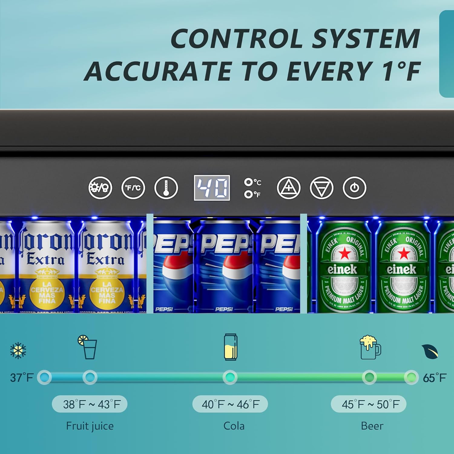 - Large Capacity & Mobile Shelf - This beverage refrigerator provides beverage enthusiasts with more spacious storage for up to 180 standard-sized cans. The beverage cooler includes 3 pull-out shelves that can be adjusted at will to space each tier on 5 fixed slots. The under counter refrigerator is equipped with a highly sensitive sensor that is adjustable from 37-65°F, and the temperature range will not exceed 3.6°F, so the drinks are at their best whenever you serve them