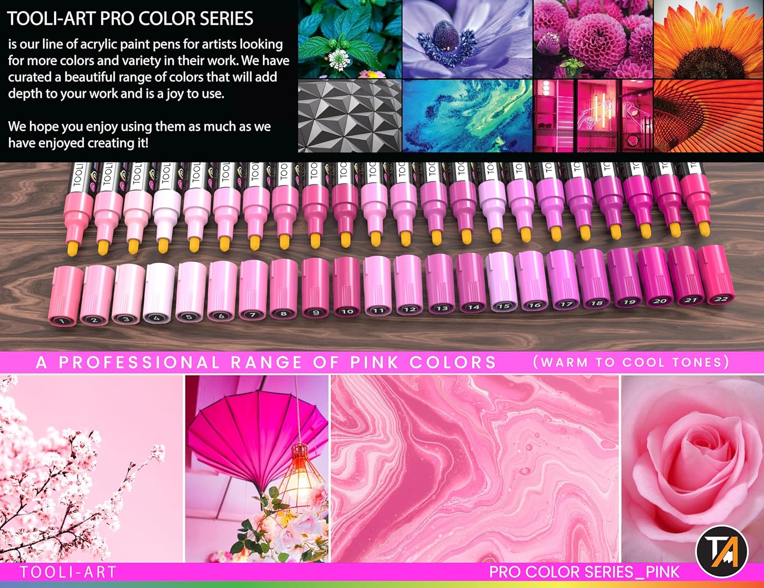 TOOLI-ART 22 Acrylic Paint Markers Paint Pens Pro Color Series Set 3mm Medium Tip for Rock Painting, Glass, Mugs, Wood, Metal, Glass Paint, Canvas, DIY. Non Toxic, Waterbased, Quick Drying (PINK)
