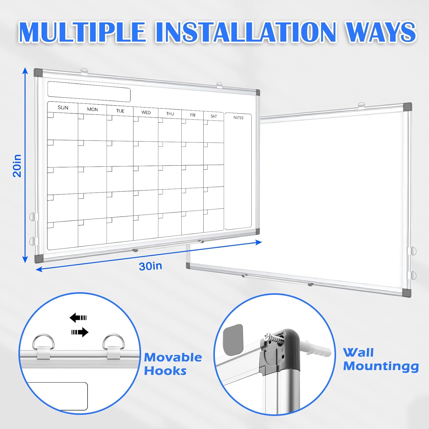 Monthly Calendar Dry Erase Whiteboard for Wall, 30" x 20" Double-Sided Large Calendar White Board, Magnetic Portable Hanging Board for Office, Home, School