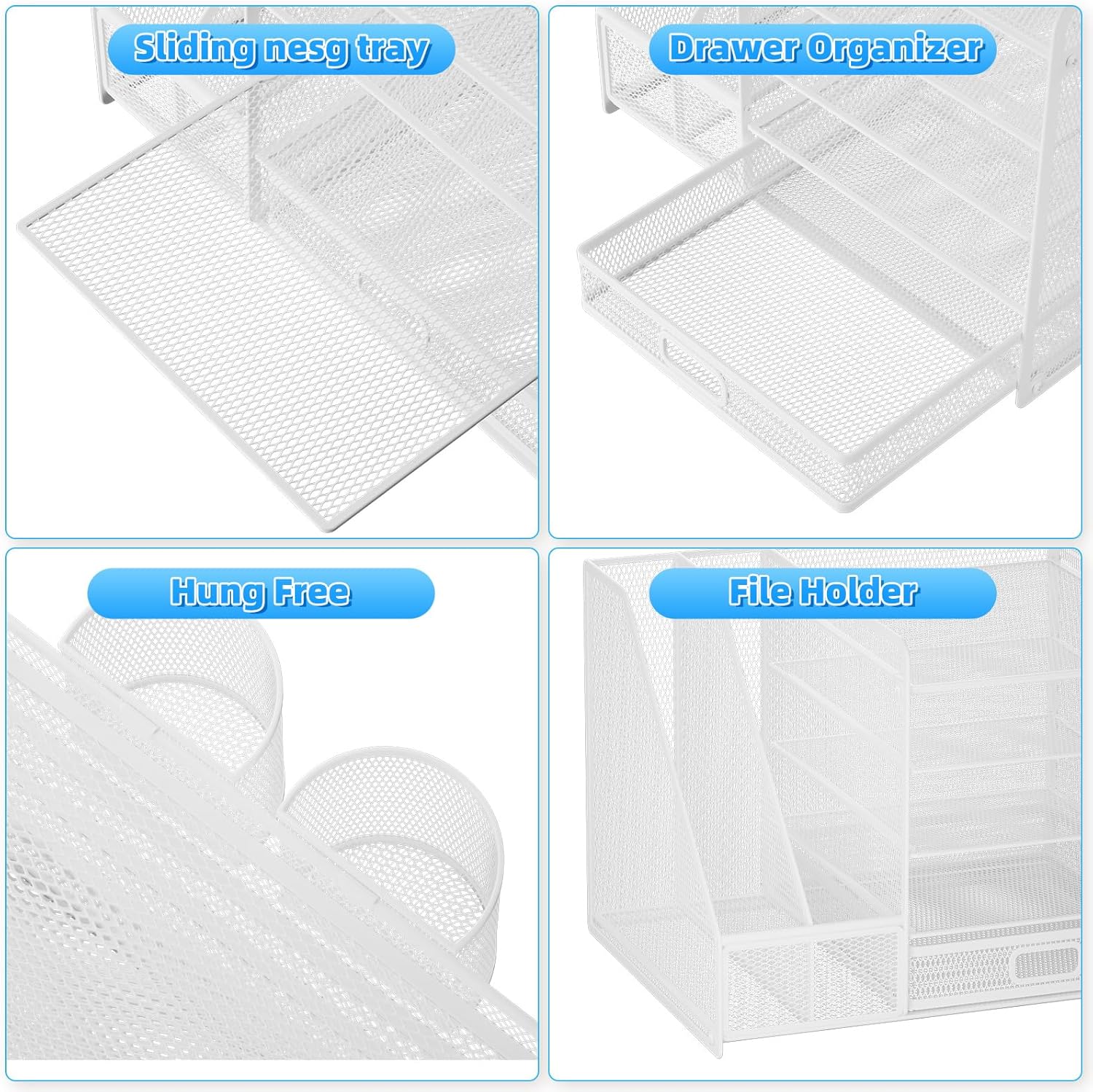 Lavatino Desk Organizer with File Holder, 5-Tier Paper Letter Tray Organizer with Sliding Drawer and 2 Pen Holder, Mesh Desktop File Organizer for Office Supplies, White