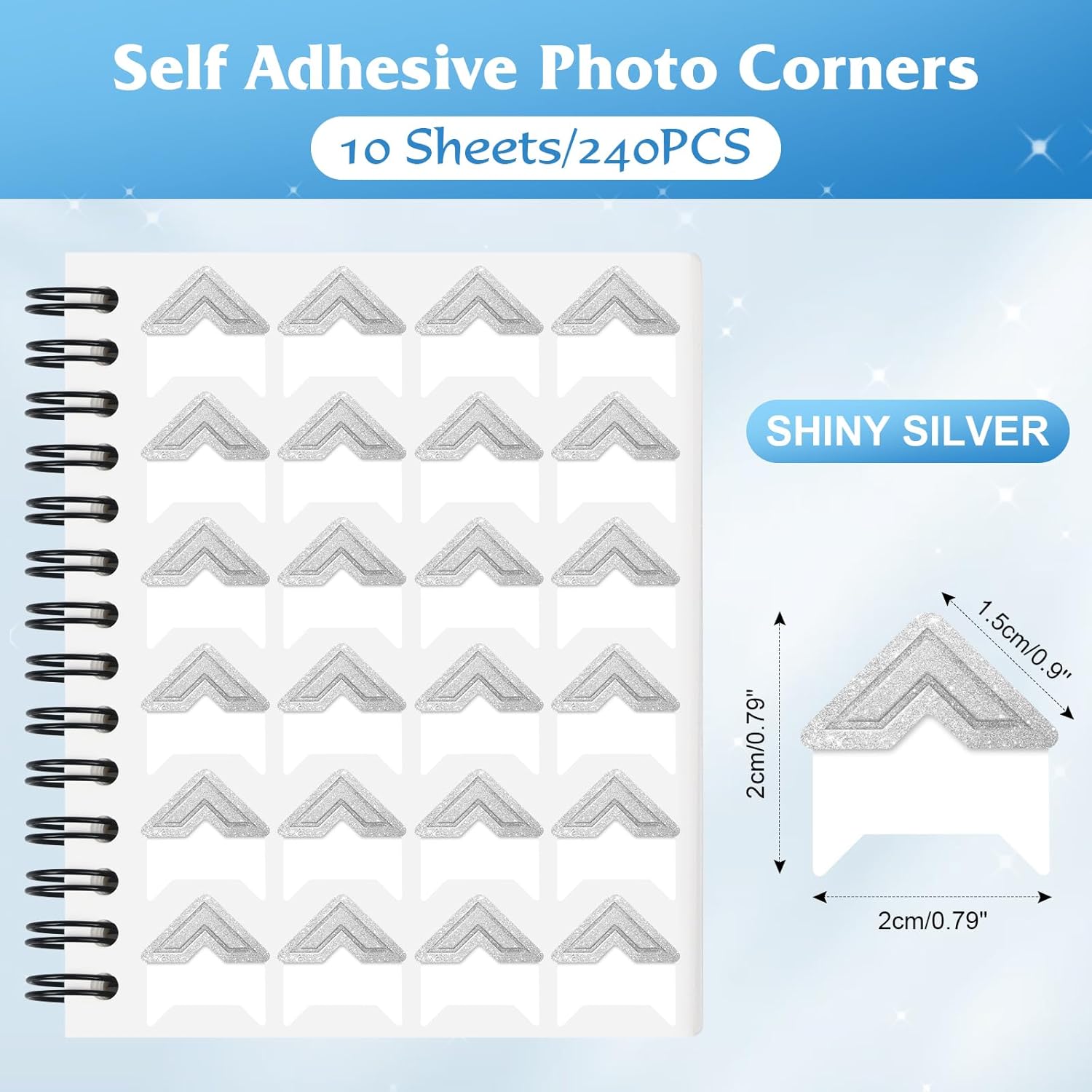 GOONAVI 10 Sheets 240 PCS Shiny Silver Acid-Free Photo Corners Notebook, Self-Adhesive Photo Corners for DIY Photo Album Journal, Photo Corner Stickers for Trip Journal Memory Book