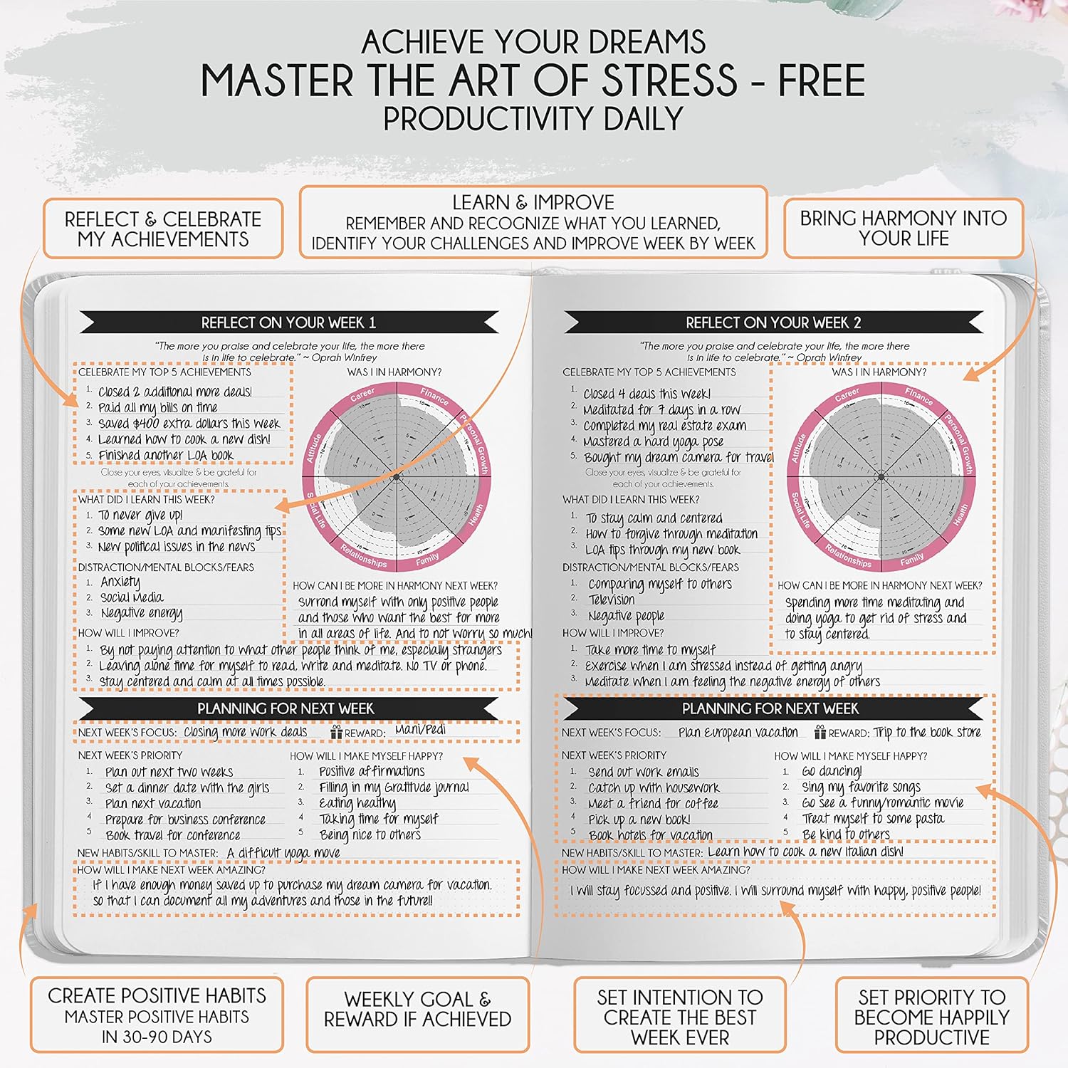 - SELF-CARE JOURNAL - This deluxe daily planner and gratitude journal comes in A5 size (5.8 x 8.3 inches). The life planner comprises 264 pages of thick 100 gsm paper, including 90 daily planning sheets, guiding you on how to become the best possible version of yourself on a mental, physical, and interpersonal level. It's a unique diary based on leading scientific studies proven to increase productivity and happiness. The journal features an out-foldable vision board to help you stay focused, morning and evening power questions, mind maps, reflection pages, habit trackers, a back pocket, and much more than any other planner on the market!