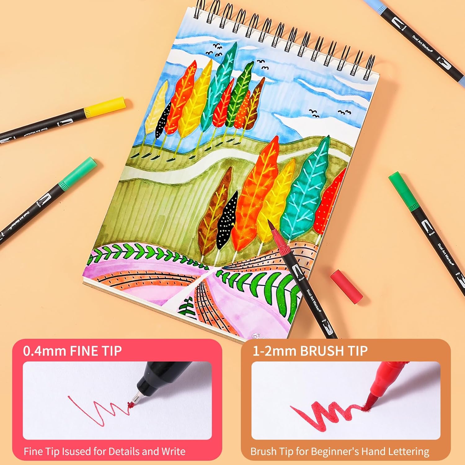 - Double-tip MARKER DESIGN:Double-tip Brush Pen allows you easily switch between creating crisp details and laying down thick, thin, or varied lines in one stroke. 0.4mm fine tip is great for sketching, outlining, and details, works well for intricate coloring books, writing, and doodling; 1-2mm soft brush tip for shading, coloring, quickly coloring in large areas art projects, hand lettering, and calligraphy beginners.