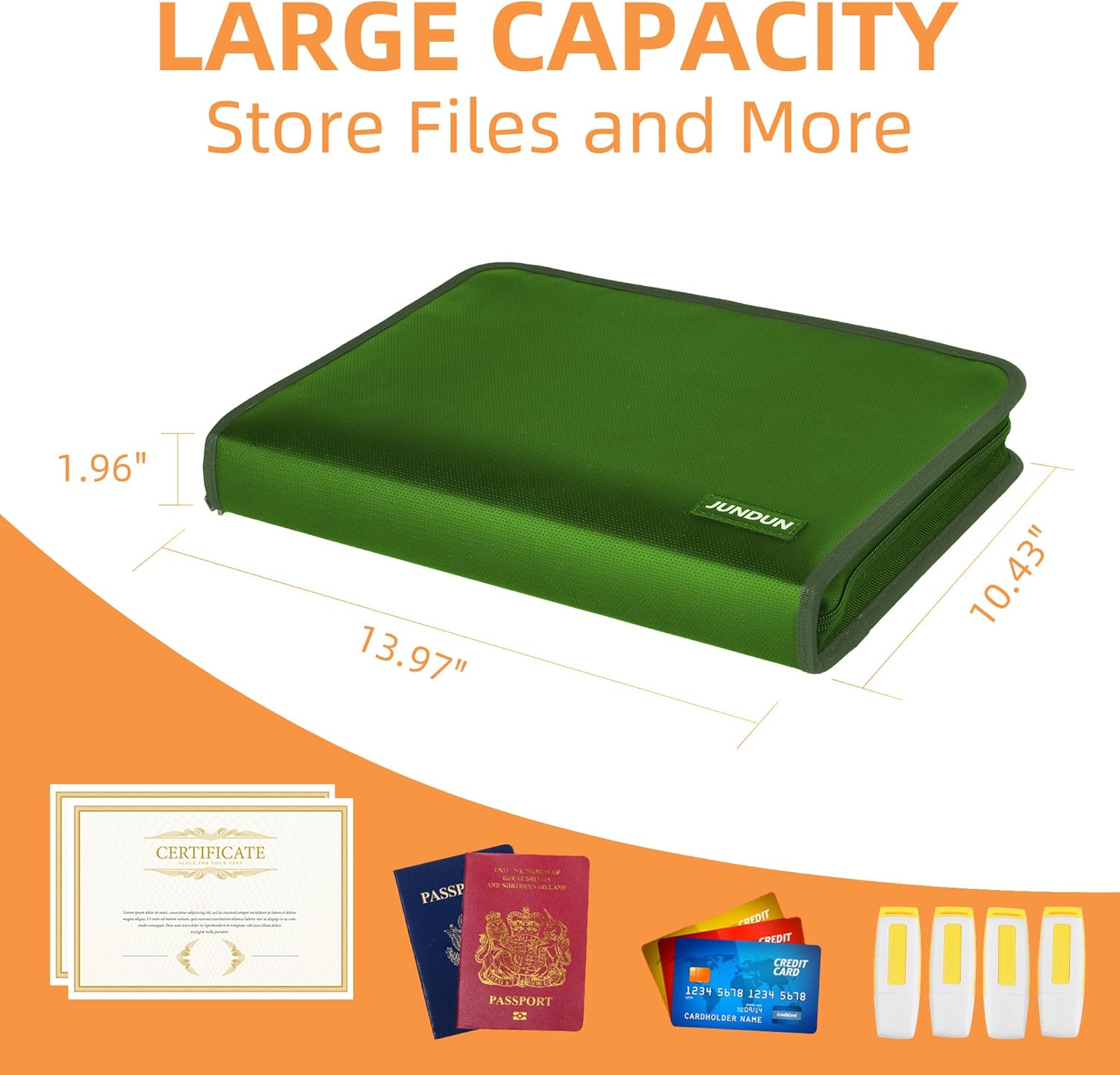 JUNDUN Accordion File Organizer - Fireproof Accordion Folder with Zipper & Labels - 12 Pocket Expanding File Folder with Multi-Pockets Paper Organizer Folder for Letter A4 Files More (Green)
