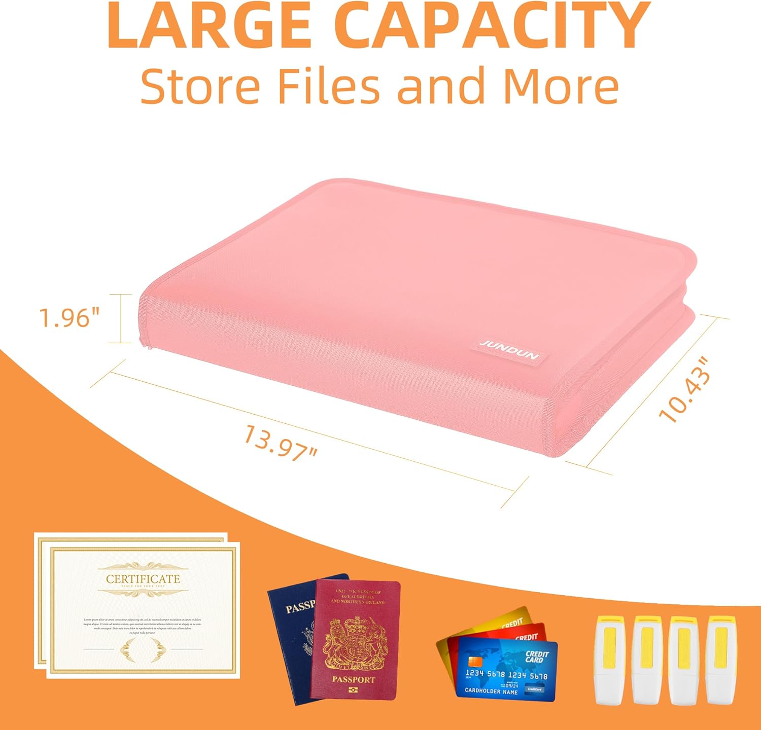 JUNDUN Accordion File Organizer - Fireproof Accordion Folder with Zipper & Labels - 12 Pocket Expanding File Folder with Multi-Pockets Paper Organizer Folder for Letter A4 Files and More (Pink)