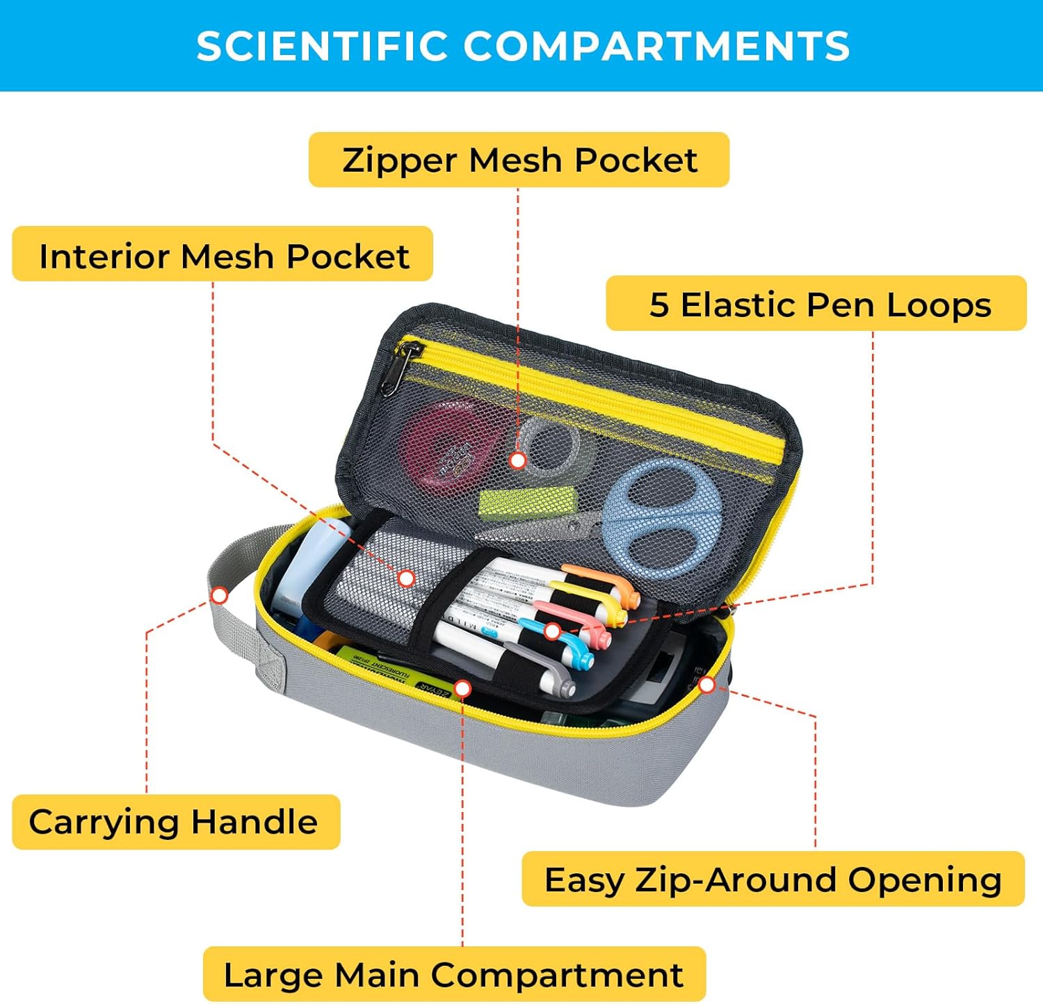 - PREMIUM MATERIAL: Pencil Bag has an upgraded 3 layer fabric structure. The exterior is made of high quality 1200D Oxford fabric, which is comfortable, water resistant, impermeable, scratch, and hard wearing. The interior is 6mm foam padded to provide softer support and more protection for your essentials. Double zips with silicone sliders for smooth operation and easy grip