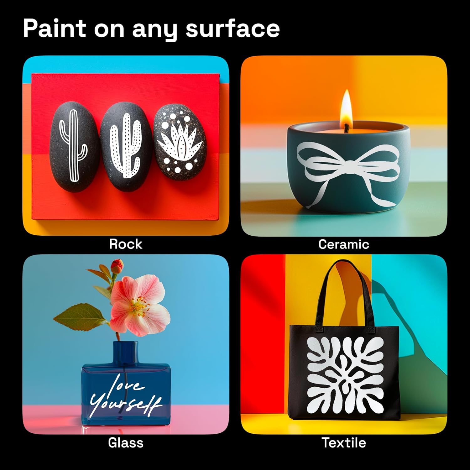 - PREMIUM QUALITY: This white-pack of paint pens features high-quality acrylic paint that dries opaque, so you donβt have to make a second layer! The ink in the paint markers for canvas is water-based and features a durable nib.