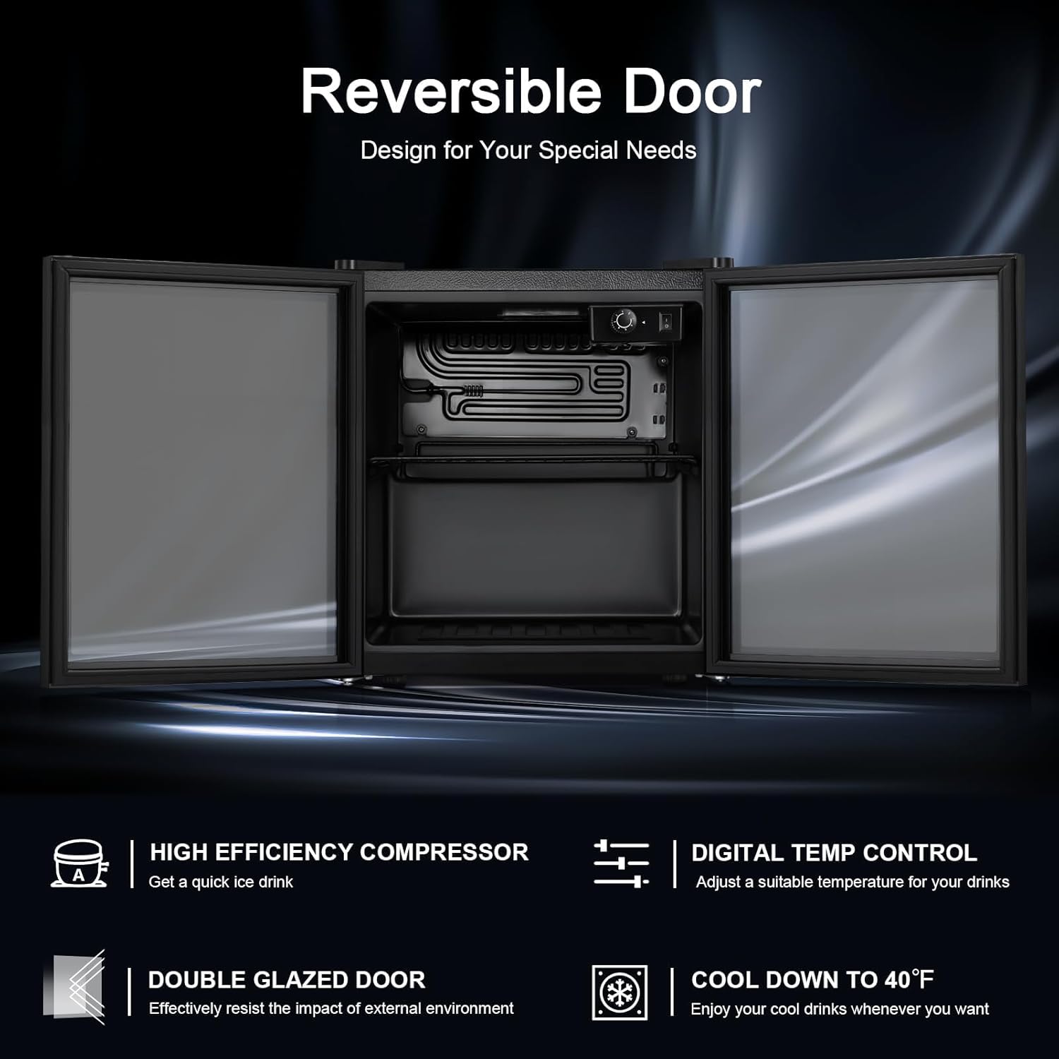 - IDEAL BEVERAGE COOLER: 16.46"D x 16.93"W x 18.5"H mini refrigerator can keep a variety of canned drinks or wine chilled without taking up too much space at your home, dorm, bar or office. It can conveniently hold 48 standard-sized drink cans . The interchangeable design of the left and right doors facilitates the selection of storage locations, adapts to the high-quality needs of different people and different locations.