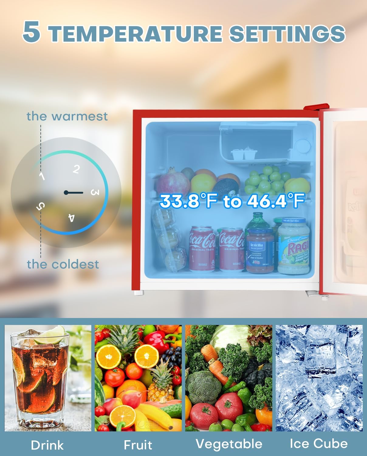 - Adjustable Temperatures: Ranges from 33.8Β° F to 46.4Β° F (Not for storing ice cream), the fridge offers 5 variable temperature settings per your need. Includes a compact freezer that allow you to make ice cubes, keep your food fresh and drinks chilled