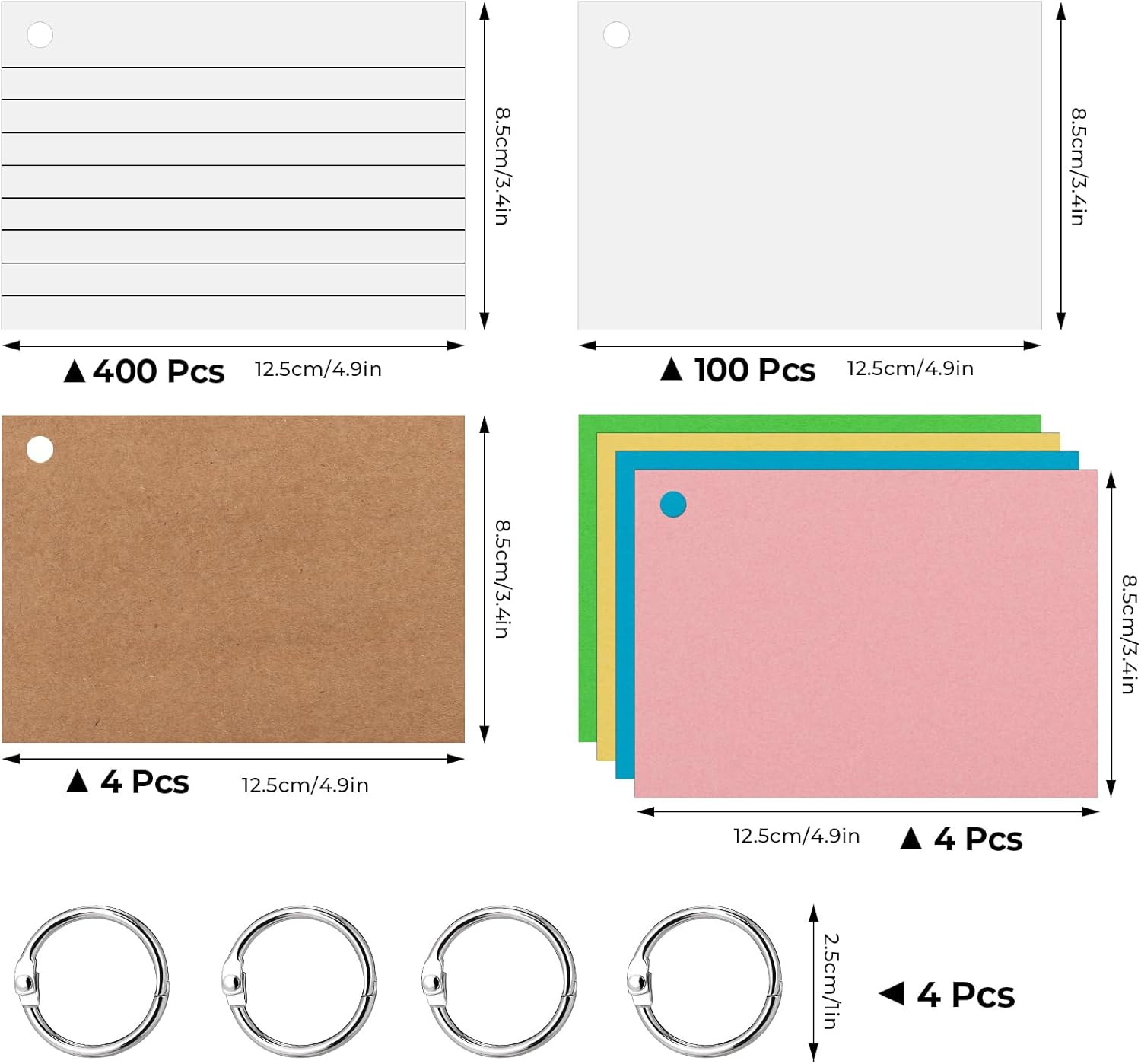 - A Total of 500 Sheets: Ruled study Cards dimension 12.5 x 8.5cm/5 x 3 in,Our Index Cards set includes 400 flash cardss in white colors,100 blank cards,4 coloured dividers paper, 4 brown paper cards protecting the index cards from daily wear and tear.4 binder rings for convenient organization. Sufficient quantity to meet your daily use and replacement demands, and you can also share some with your classmates or colleagues