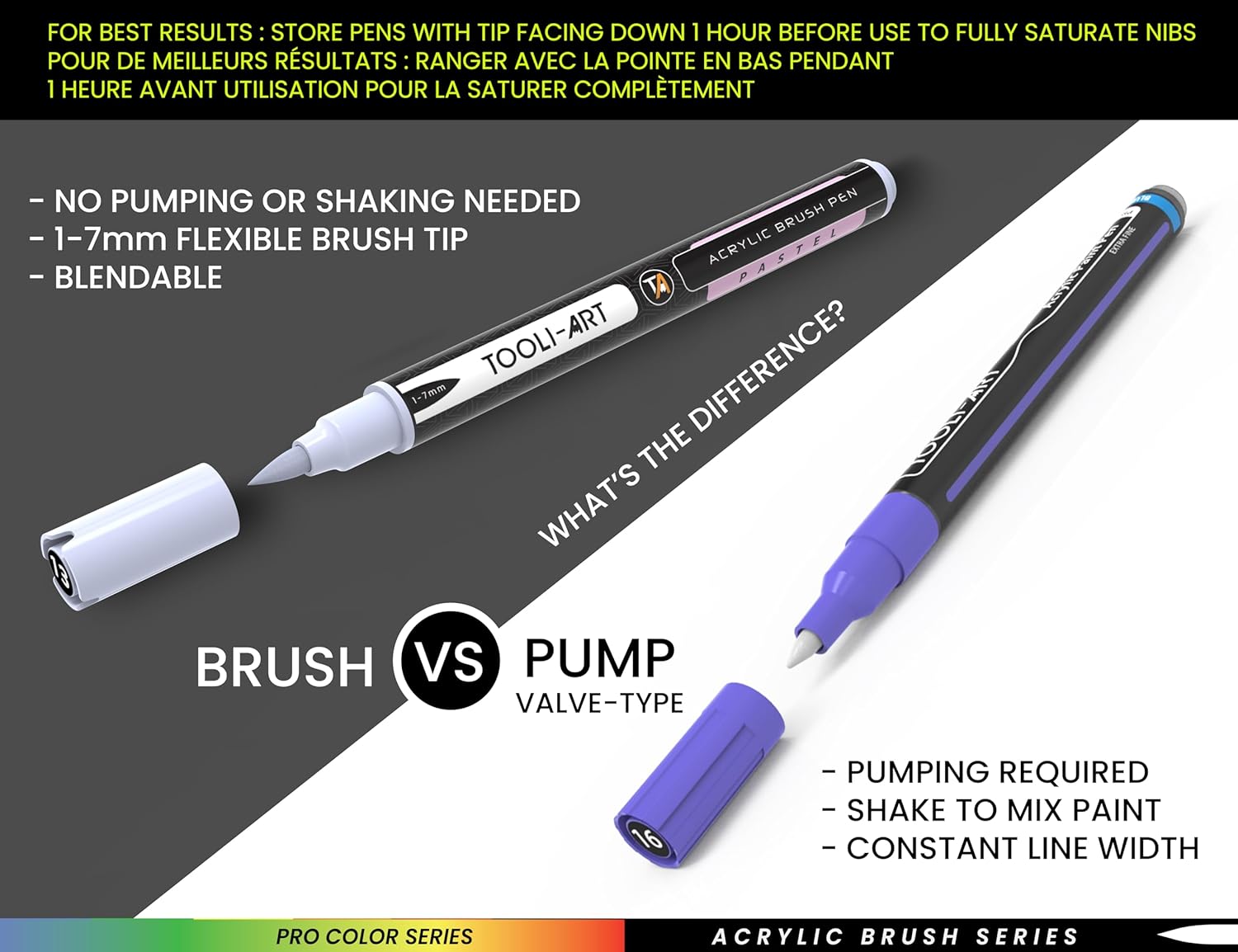 - ✔️FLEXIBLE BRUSH TIP – The pens are ready to paint without having to shake and prime the tips like traditional paint pens. The flexible brush tip makes color blending easier and can vary from a thin 1mm up to a bold 7mm line width, depending on the pressure applied. Paint pens are great for avoiding the mess that typically comes with cleaning brushes and pouring paint and are easy to travel with.