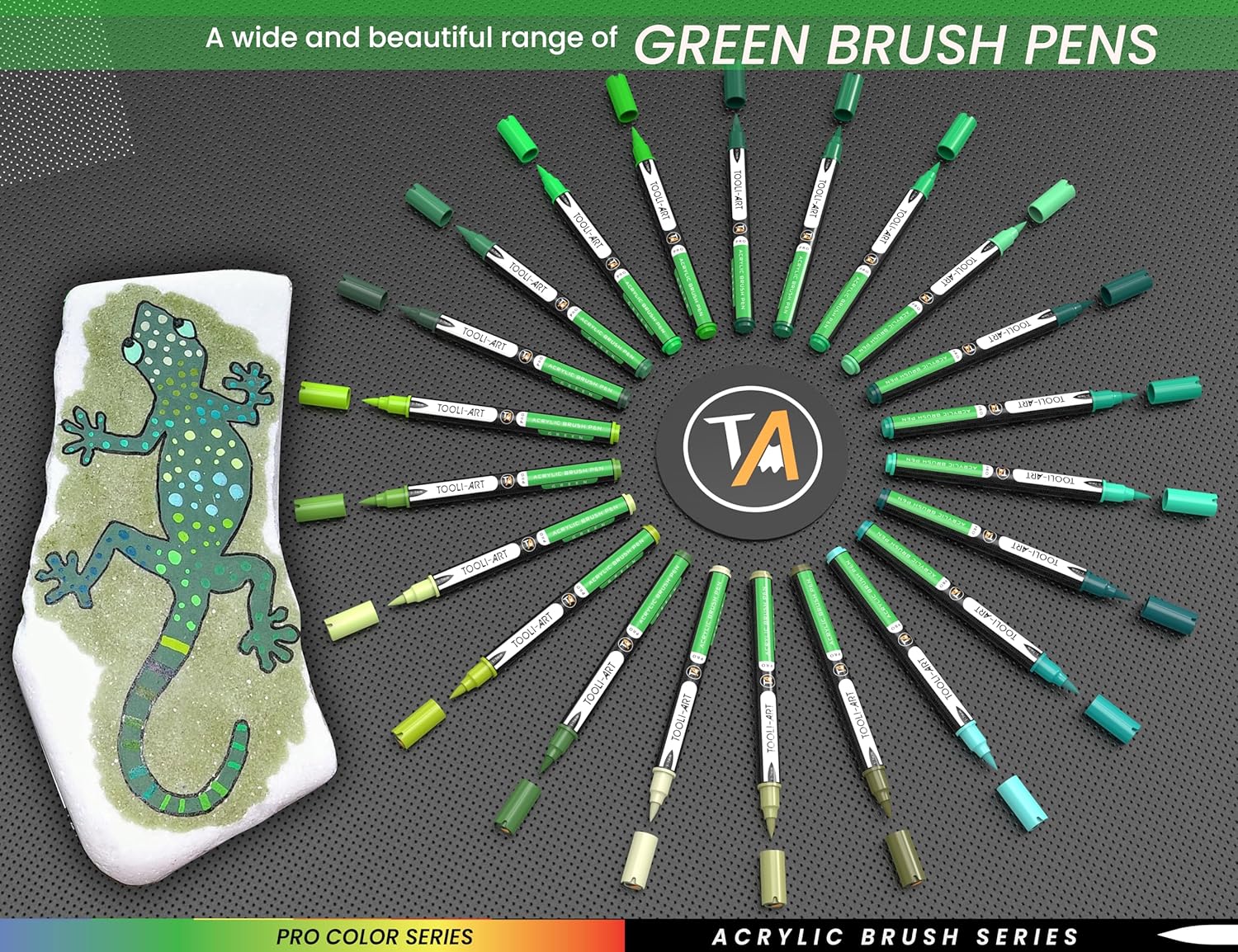 22 Flexible Brush Tip Acrylic Paint Pens Markers Set 1-7mm Line for Rock Painting, Brush Lettering, Glass, Mugs, Wood, Metal, Canvas, Fabric, Plastic. Non Toxic Waterbased Quick Drying Assorted Green