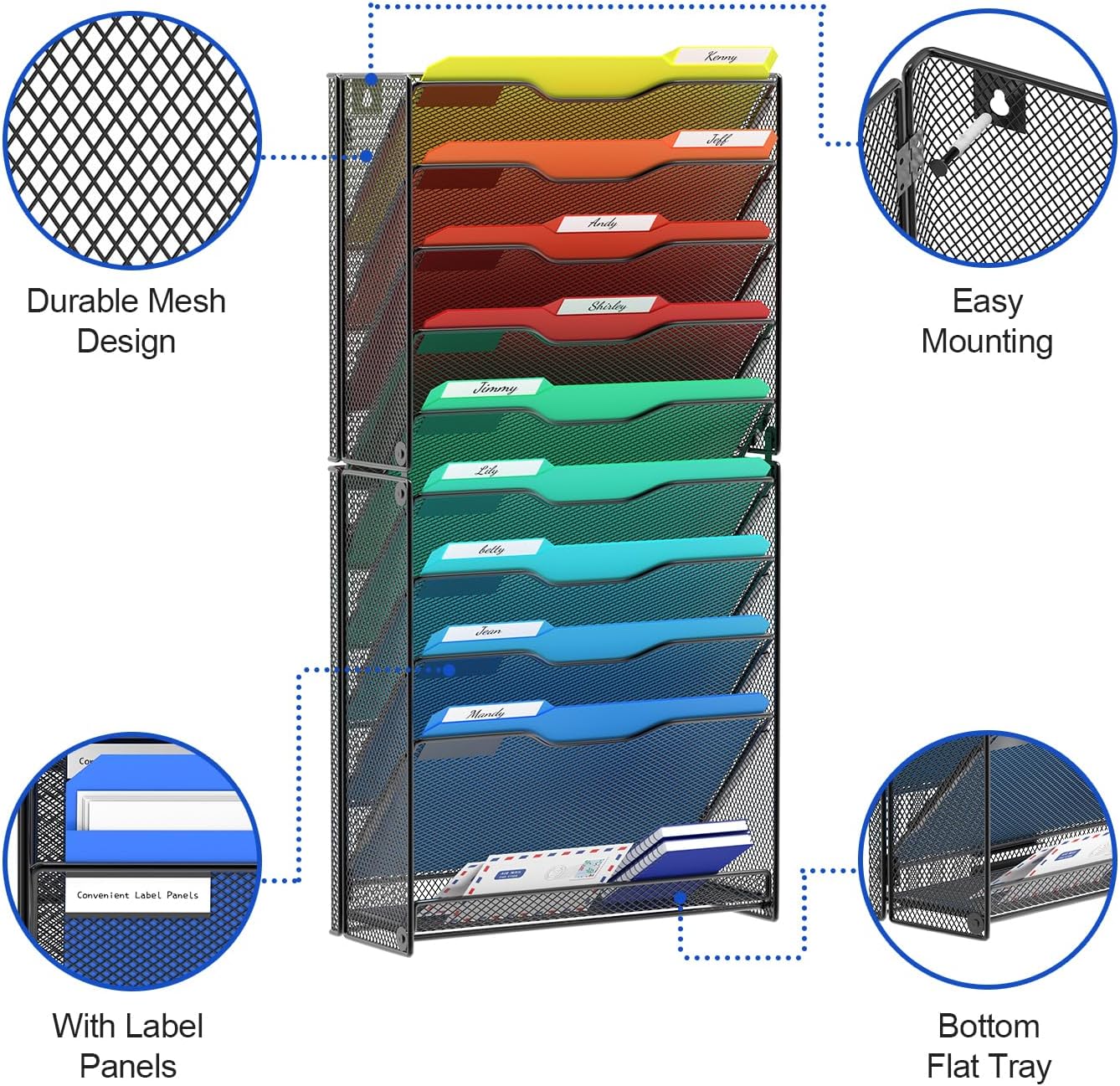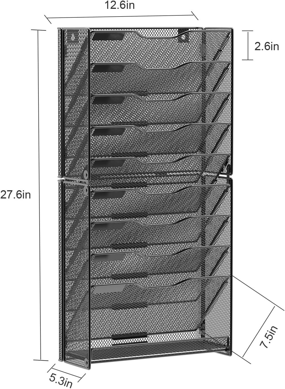 samstar 10 Tier Wall File Organizer, Hanging Wall Mount File Holder Paper Folder Mail Organizer, Mesh Metal, Black.