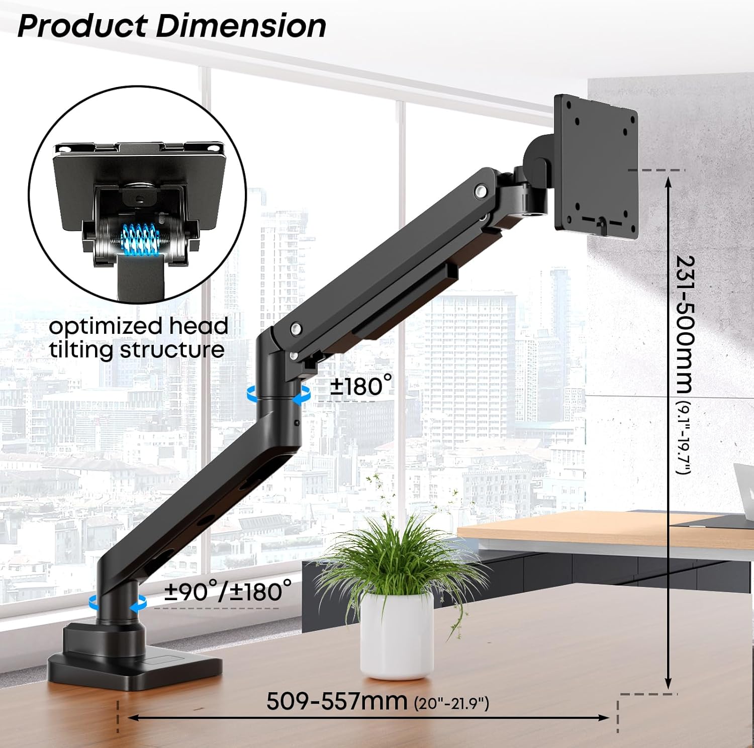 - Full Motion Design: This monitor arm features 50° tilt up and 20° tilt down, 180° swivel, 360° rotation and 20" height range for superb flexibility, allowing you to place screen in the best view or elevate your monitor to relieve neck and back strain and optimizes desk space
