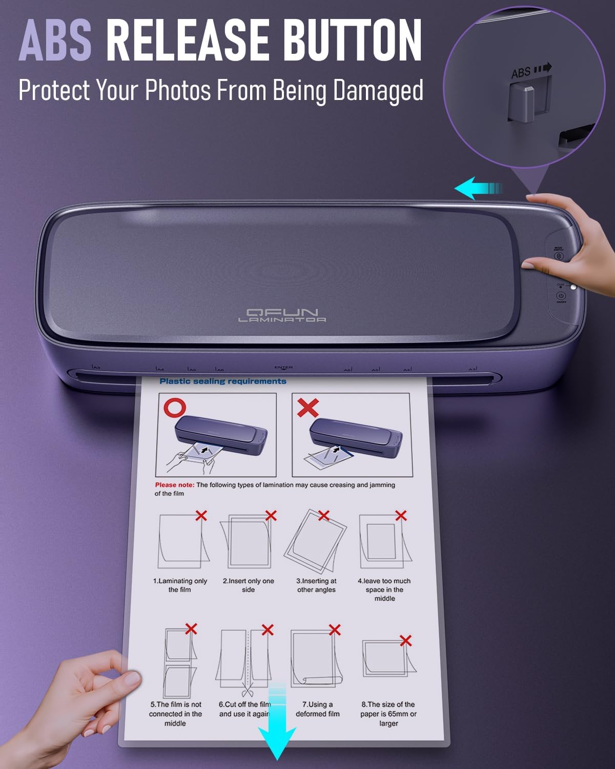 - Easy Operation Without Jams: The laminate machine with laminated paper excels in simplicity with no complex setups. The intuitive control panel and user-friendly interface make operation a breeze. Thanks to the short warm-up time and fast lamination speeds, you can achieve professional results without hassle. Say goodbye to paper jams, just press the ABS button to clear them and safeguard your important documents