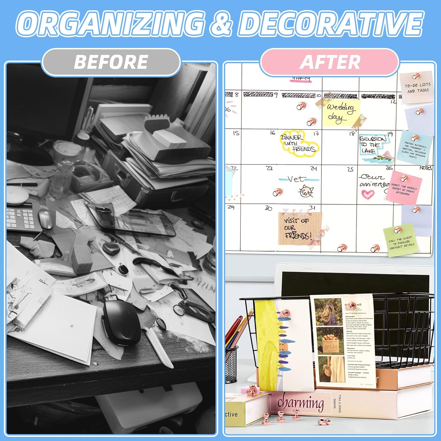 - Versatile Use: These small strong magnets are perfect for keeping your kitchen, office, or classroom organized. Use these magnetic push pins on magnetic surfaces like whiteboards, refrigerators, lockers, and bulletin boards to display notes, photos, calendars, greeting cards, recipes, schedules, artwork, or memos. They’re also ideal for practical uses like hanging jewelry, keys, utensils, or small tools, making them a must-have for both creative and functional spaces.
