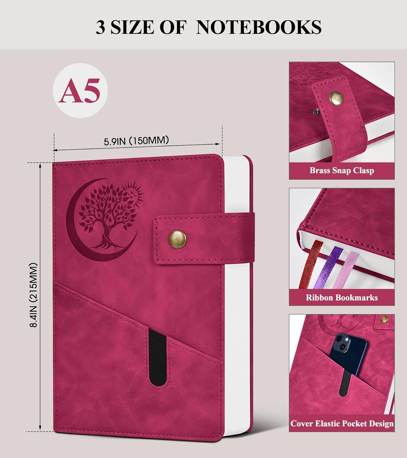 - 【CONVENIENT FEATURES FOR ORGANIZATION】:The leather journal includes 3 ribbon bookmarks, allowing you to easily mark important pages or sections. The 180° lay-flat design ensures that the notebook lies flat on any surface, making it comfortable to write in for extended periods. The metal snap closure design keeps the notebook securely closed, protecting your notes from damage.These features make the notebook a versatile tool for various settings, from work and school to personal use.