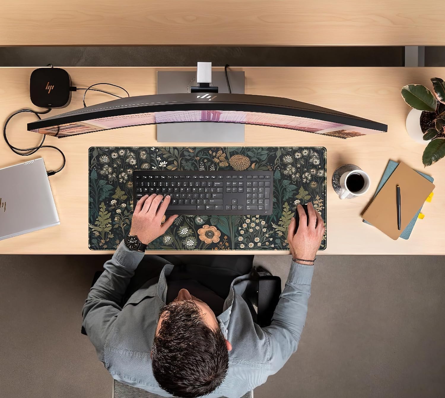 Dark Flower Desk Mat Floral Plants Mouse Pad, Aesthetic Wildflowers Large Gaming Mousepad Desk Pad, XXL Keyboard Mouse Mat Full Desktop Mat Women Office Desk Accessories Cover Mat 31.5"x15.75"