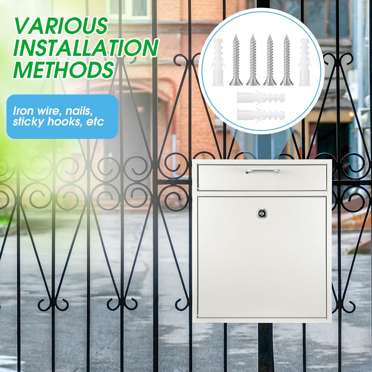 - Quality Material: crafted from quality metal material, this robust drop box promises durability; The wall mount mailbox is coated with creamy white plating which prevents peeling off paint and rust, extending the product's service life