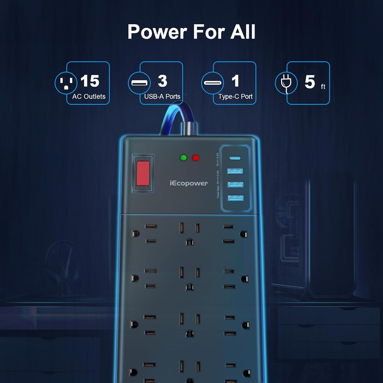 Surge Protector Power Strip-15 Widely Spaced Outlets and 4 USB Ports(1 USB C Port),14 AWG Extension Cord,1875W/15A Heavy Duty Power Strip Surge Protector 5 ft Cord,2800J,Black