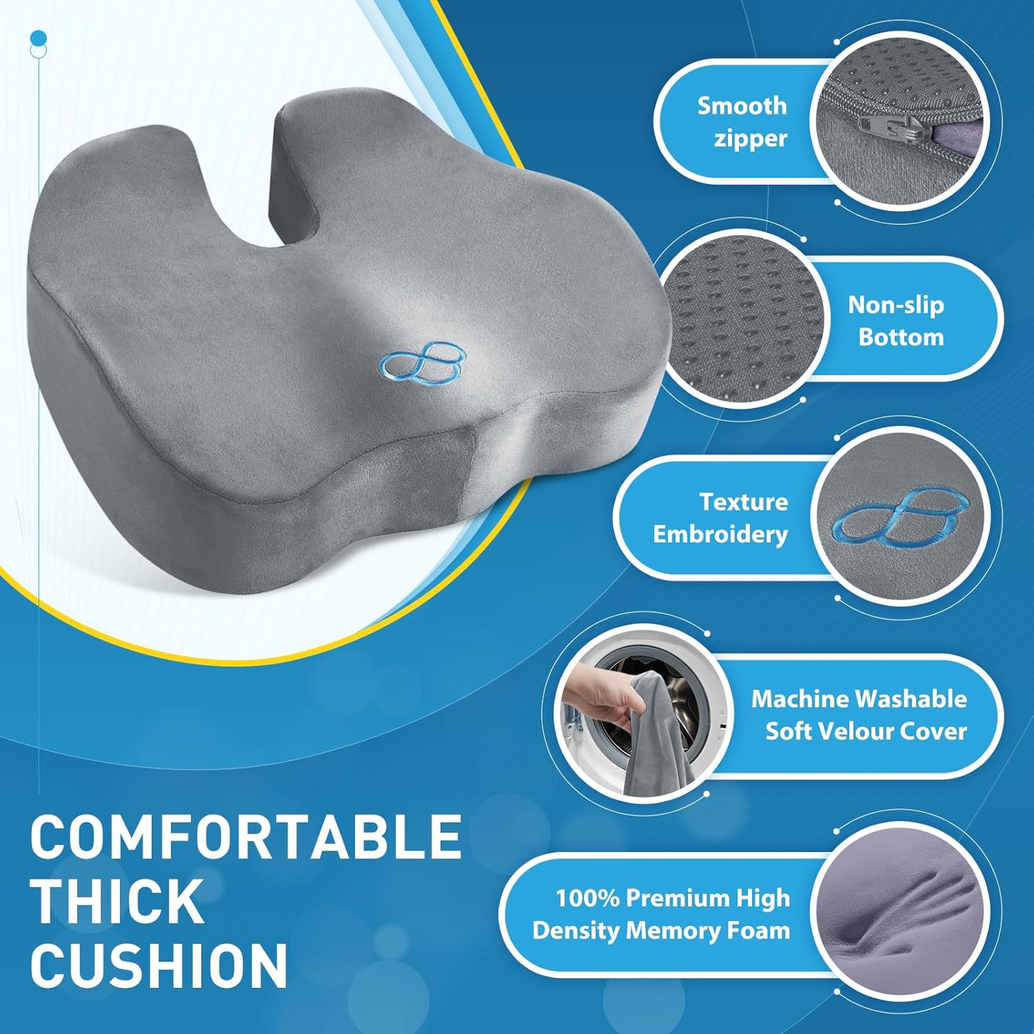 BlissTrends Seat Cushion,Thick Memory Foam Cushions for Office Chair, Car Seat, Airplane, Relieving Pressure Tailbone Sciatica Back Pain for Office Workers, Car Drivers 4.7in Thick LightGrey