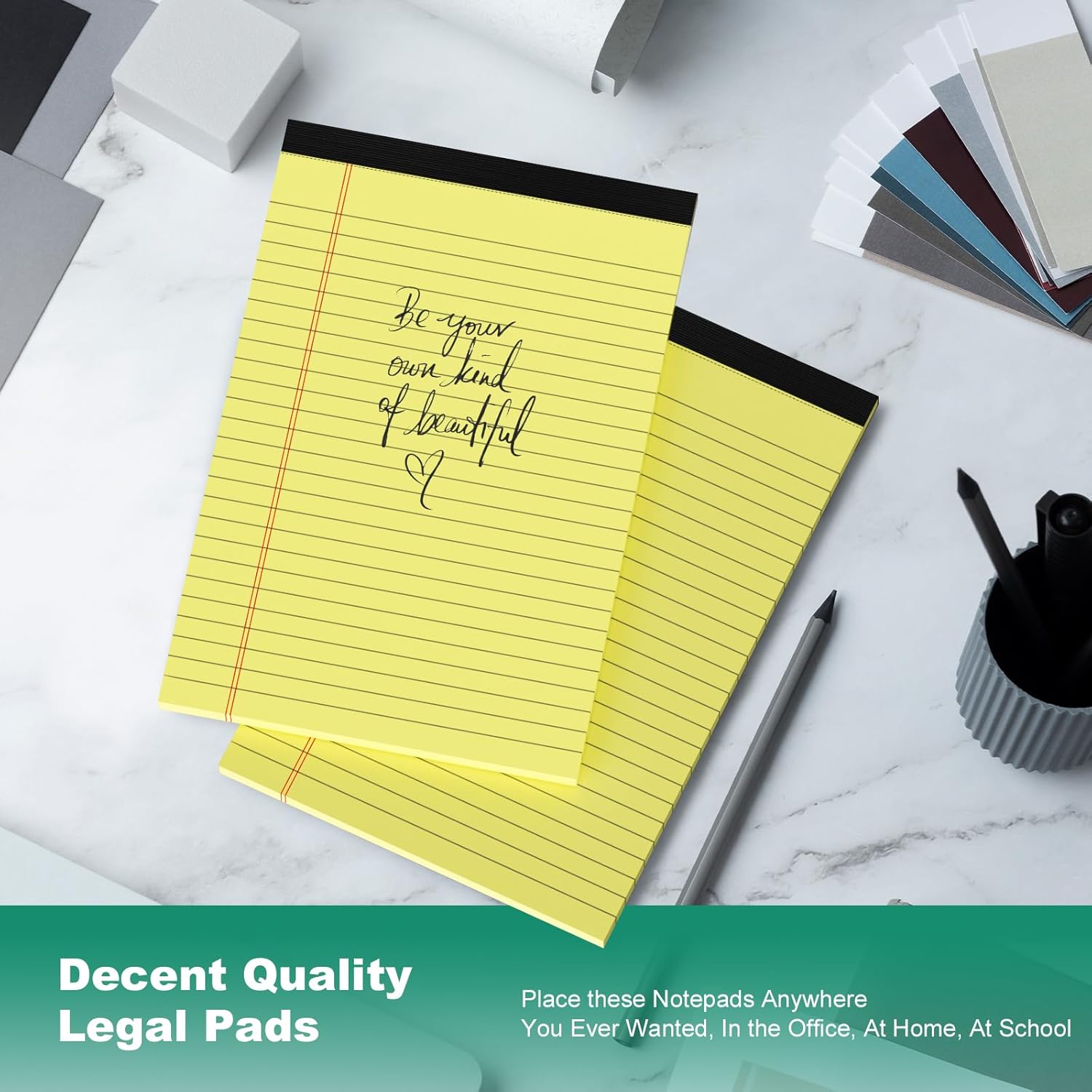 - 【Premium Quality Paper】The 5x8 yellow legal notepad is made of high quality paper material that prevents ink from seeping between the pages, easy to write or draw on, neutral and ballpoint pens writes smoothly and effortlessly on the notepad. 5"x8" Writing pads features a cardboard backing for extra support when you writing or taking note, legal pad 5x8 perfect for writing on the go.