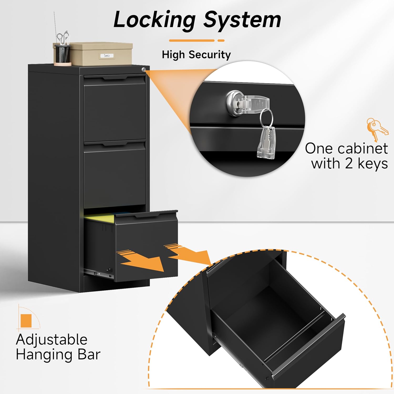 - 🛎️【SMOOTH MUTE SLIDE RAILS】: Our metal file cabinets are made with full retractable mute slide rails, open and close smoothly, easy to pick up and put down folders without noise. Perfect for office, home and school use. And the vertical appearance design can maximize the effective use of space, so that your space is not wasted!