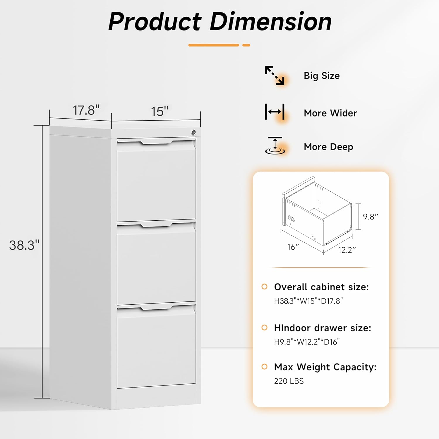 Bestoo 17.8" D File Cabinet, 3 Drawer Metal Filing Cabinets with Lock, Locking Vertical File Cabinet for Letter/Legal/A4/F4 Size, Easy Assemble (White)