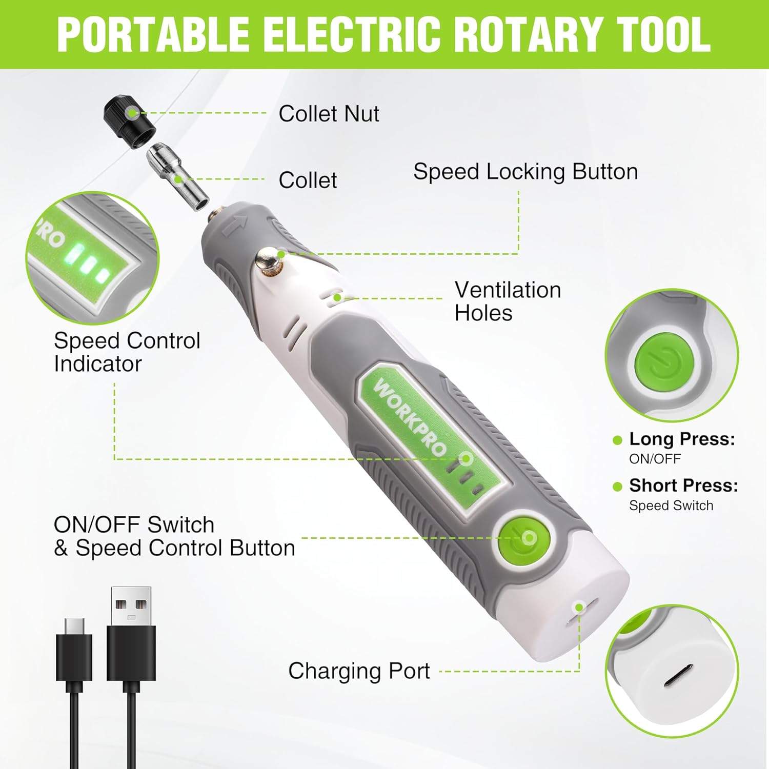 WORKPRO Cordless Rotary Tool Kit with 71pcs Accessories, 3 Variable Speeds, USB Rechargeable Mini Rotary Tool for Engraving, Sanding, Polishing, Carving, Cutting, DIY Crafts