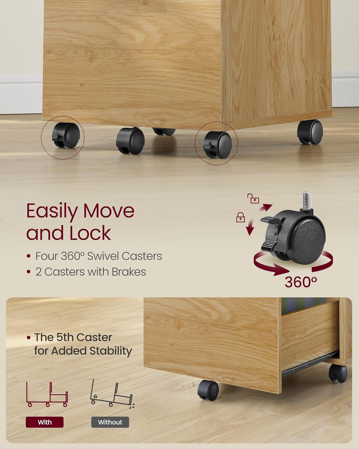 - 【LOCKABLE, SWIVEL CASTERS】Five 360° swivel casters allow you to move this filing cabinet around with ease. The 2 front casters are lockable to keep the cabinet in place when stationary and the fifth wheel on the bottom drawer adds to overall stability