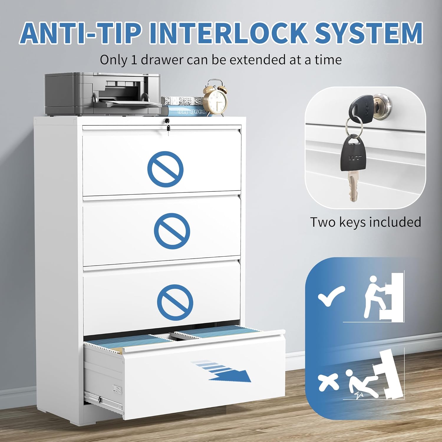- ăEnhanced Safety Featuresă To prevent tipping hazards, FLIXELIO 4 drawer file cabinet with lock includes a built-in anti-tip mechanism that allows only one drawer to open at a time. This thoughtful design minimizes safety risks and ensures stability, even when multiple drawers are in use.