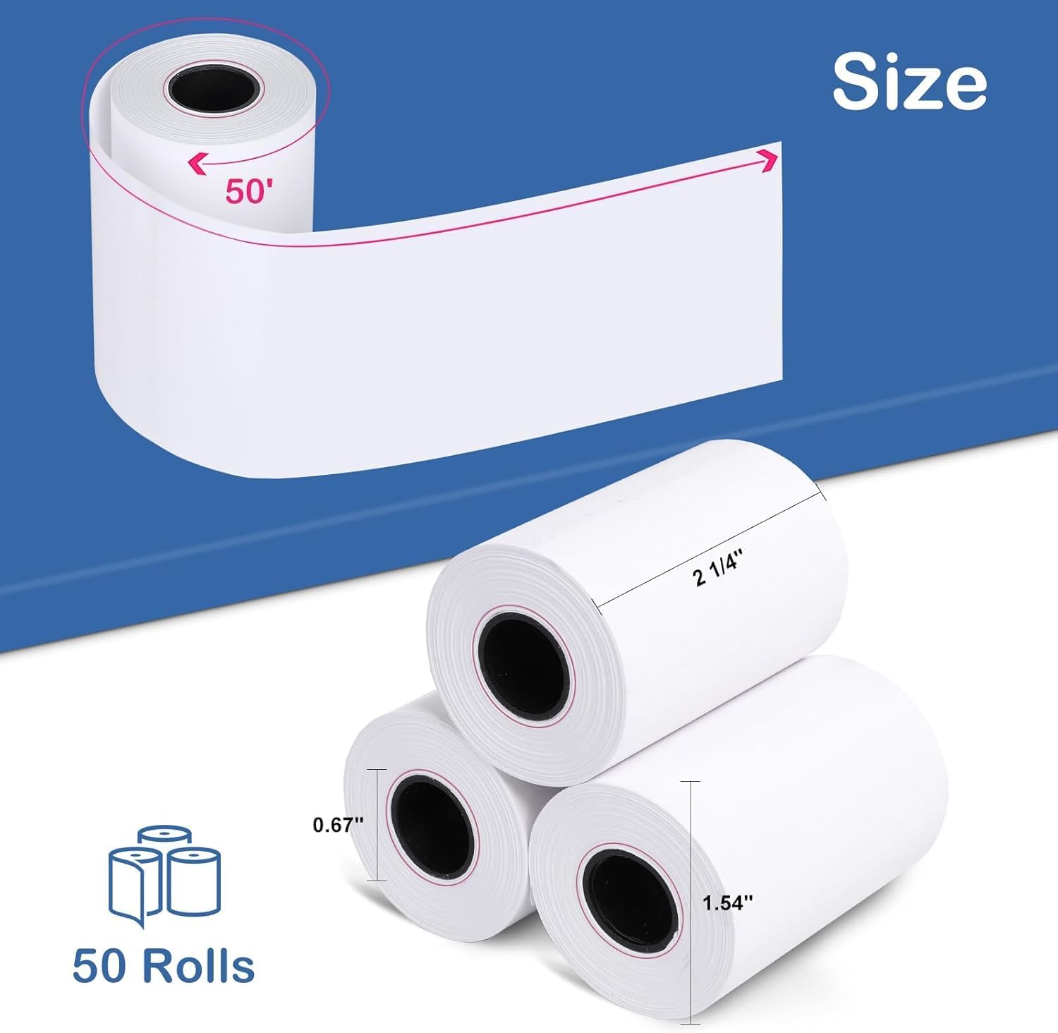 - Size: 2 1/4” (width) x 1.57” (depth) x 50 feet (length). Inner Core Diameter: 0.59 inches (15mm). Pack of 50 Rolls. BPA Free Receipt Paper.Easy to install. The 2 1/4 x 50 thermal paper rolls fits and prints out nice.