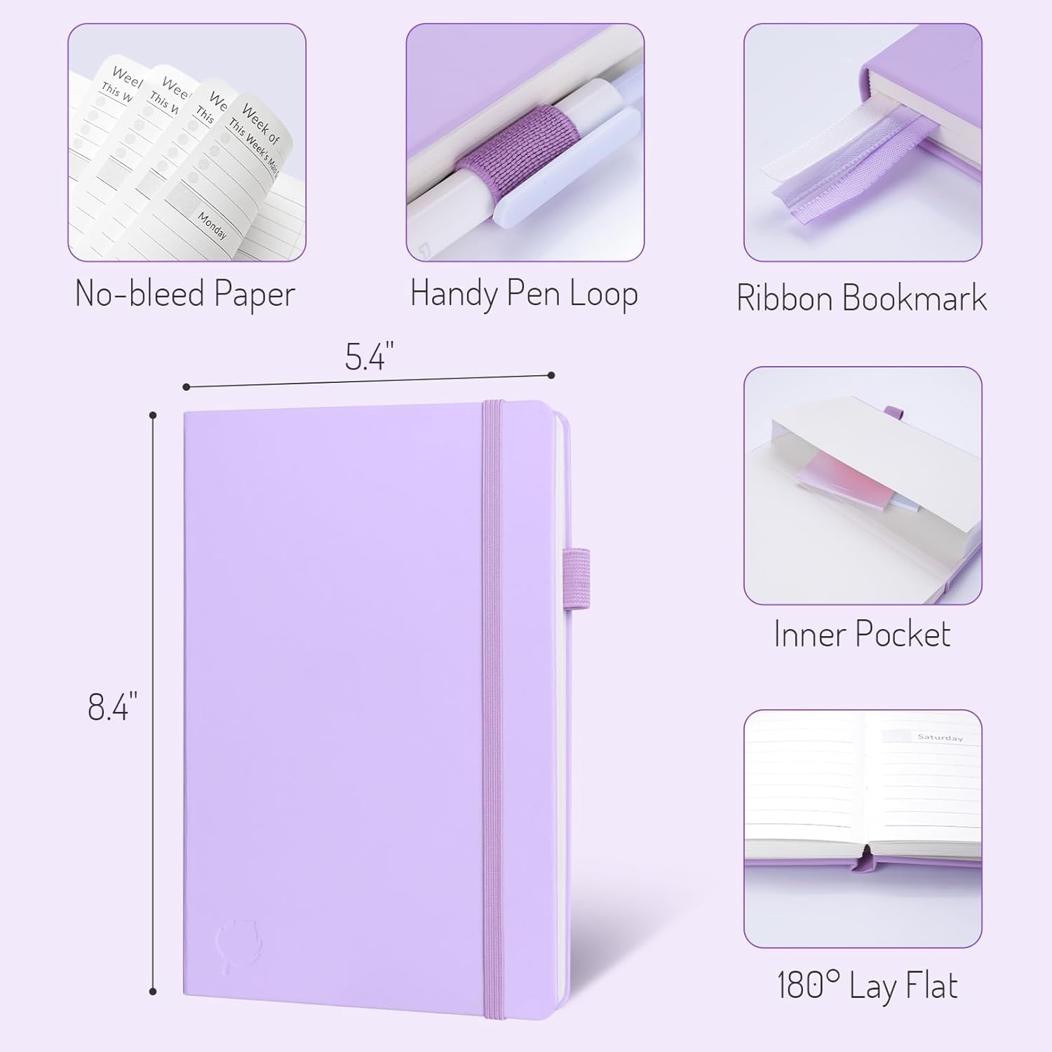 - Trusted Quality for Full Year Use: Adopted 100GSM thick paper for easy writing and preventing ink bleeding. Measuring 5.4" x 8.4", perfect size to fit in your purse or backpacks and take anywhere. Our cute planner also features an inner pocket, pen loop, and ribbon bookmarks.