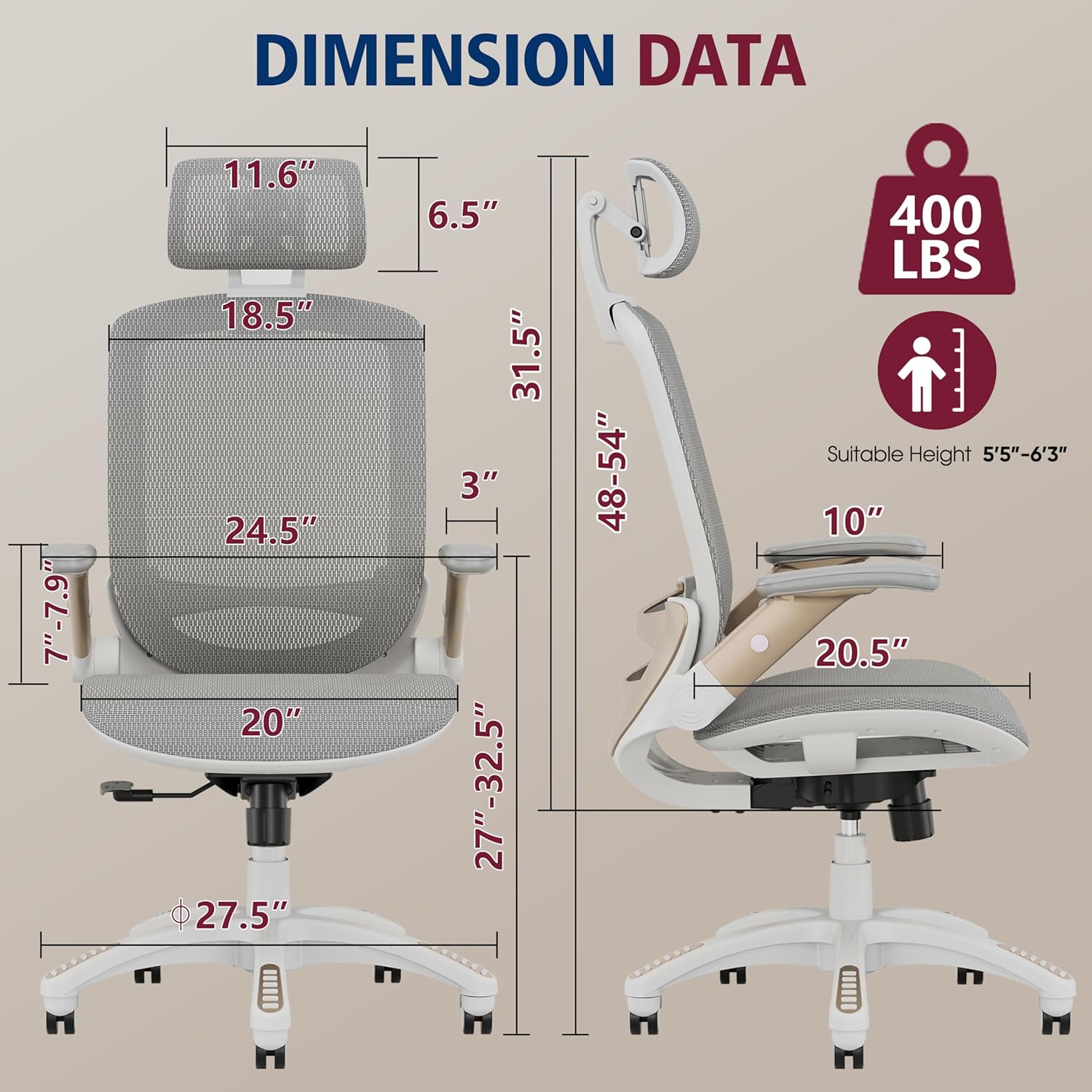 GABRYLLY Ergonomic Office Chair, High Back Home Desk Chair with Headrest, Flip-Up Arms, 90-120° Tilt Lock and Wide Cushion, Big and Tall Mesh Chairs for Man Woman, White Task Chair