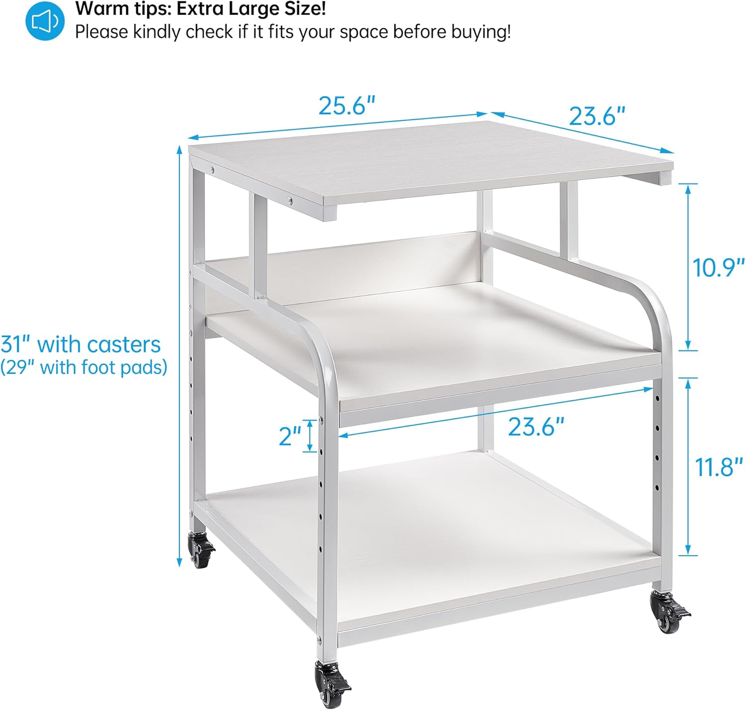 Printer Stand, 25.6" x 23.6" x 30.9" Extra Large Printer Table with Adjustable Storage Shelf, 3 Tier Rolling Printer Cart with Industrial Wheels for Home Office, White
