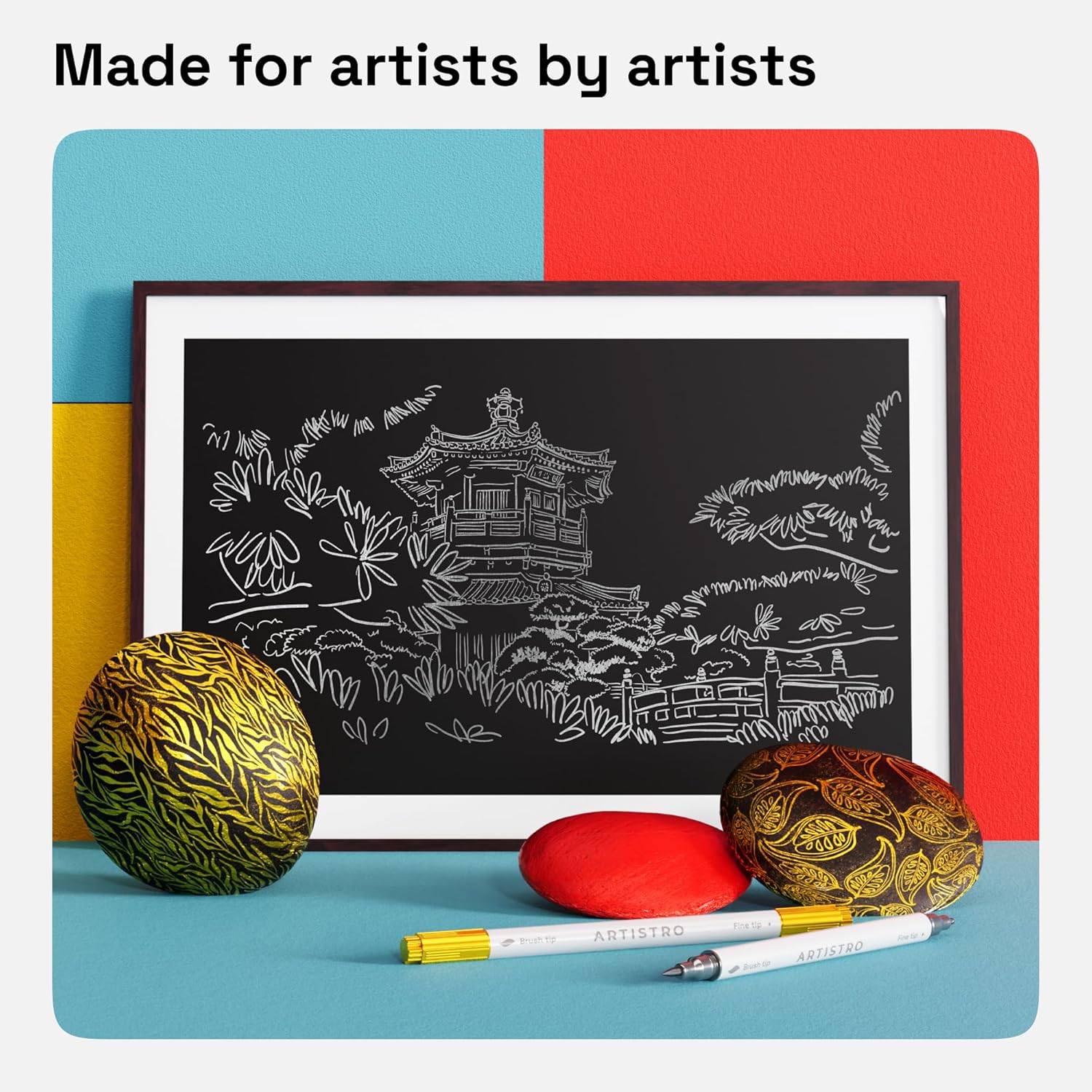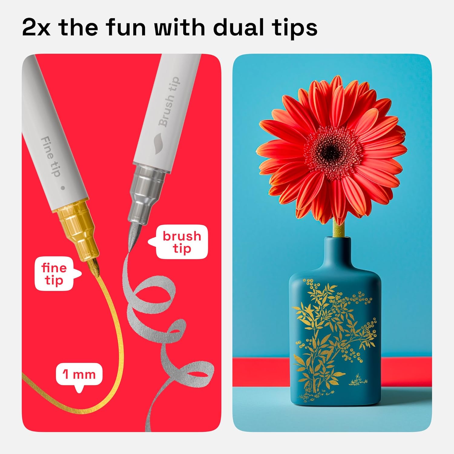 ARTISTRO 2 Silver&Gold Dual-Tip Acrylic Paint Pens - Multisurface Markers for Fabric, Plastic, & More, 1 mm Fine & Brush Tips