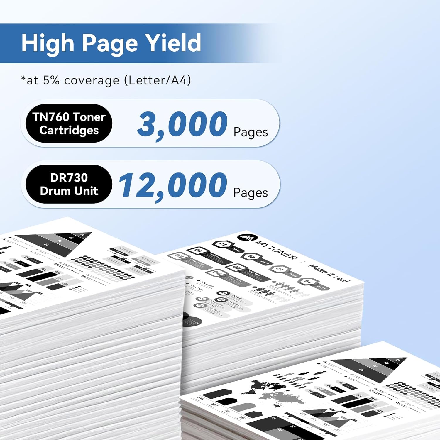 - Estimated Page Yield: Each TN 760 Toner Cartridge Can Print Approximately 3,000 Pages and Each DR730 Drum Unit Can Print Approximately 12,000 Pages (At 5% Coverage - Letter/A4)