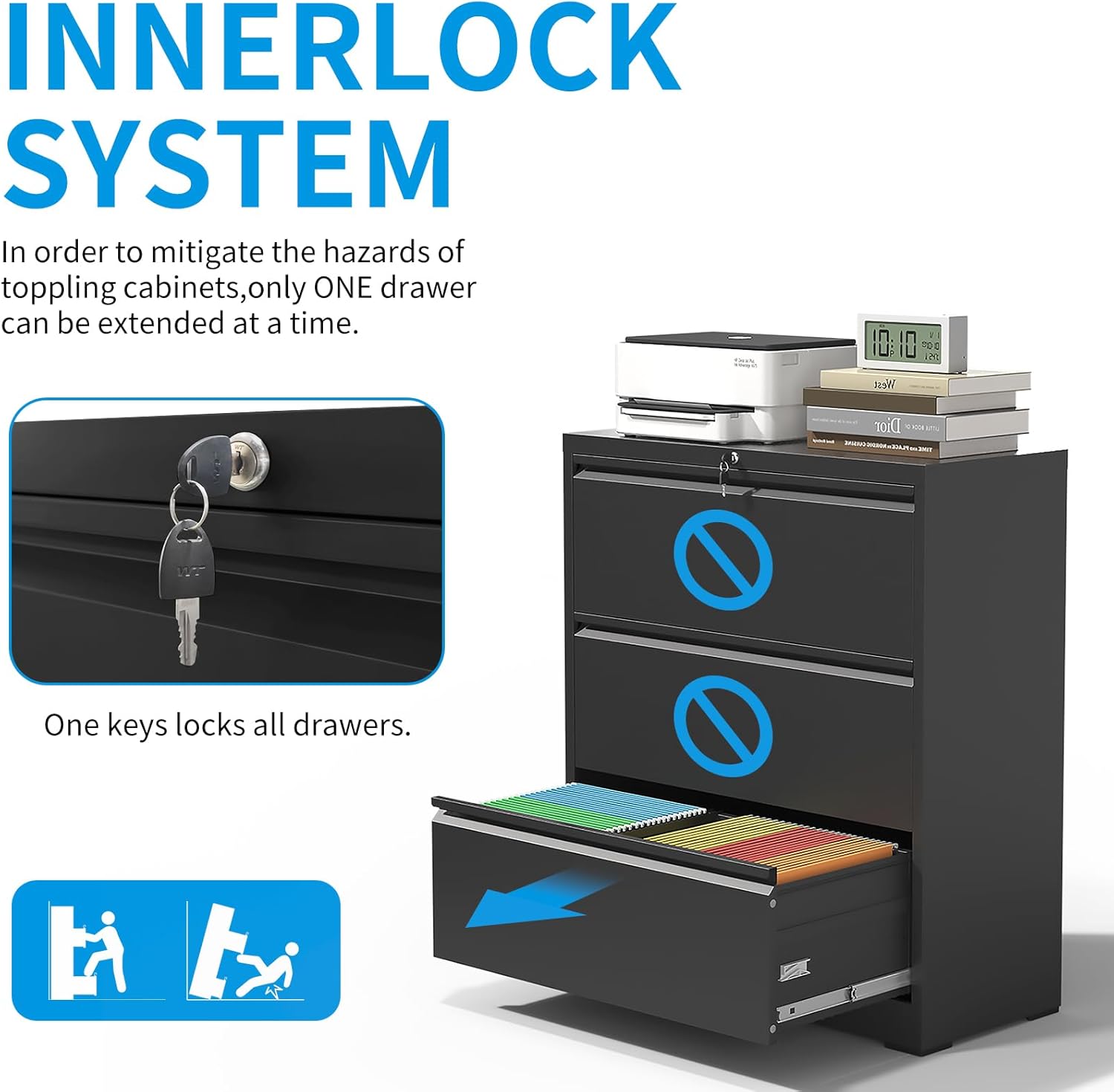 - ăSafety & SecurityăInterlock system prevents tipping when opening multiple heavy drawers. One lock with 2 keys secures all 2 drawers, add security to your home and office