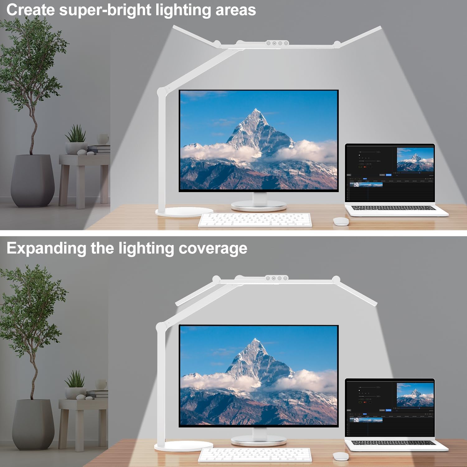 - 【5 Rotatable Joints 】Crafted to enhance your productivity, this rotatable led desk lamp features 5 rotatable joints, granting you complete control over the direction and height of your lighting. You can rotate the bilateral light bars vertically to change the illumination angle. Turn them up to expand the lighting coverage to illuminates your entire desk or turn them down to create a super bright lighting area for sewing crafting. The office light extends up to an impressive 28 inches in height.
