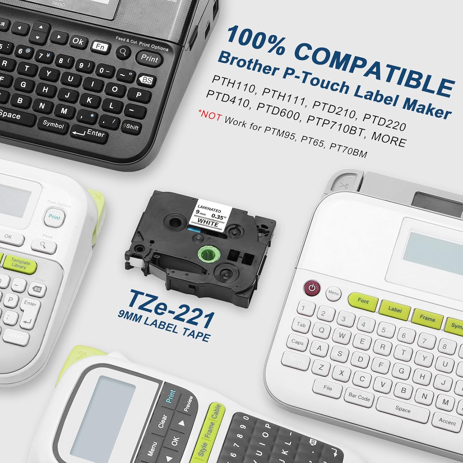 - Compatible with Brother p-touch label maker that using 9mm 0.35 white tze tape, such as PT-H110, PT-D210, PT-D220, PT-D200, PT-D202, PT-D410, PT-D400, PT-D400AD, PT-D410BT, PT-D600, PT-D610BT, PT-P710BT, PT-P700, PT-1890W, PT-P910BT, PT-H100, PT-H111, PT-D400VP, PT-D450, PT-D600VP, PT-P750W, PT-1280, PT-1290, PT-1880, PT-2030, PT-2730, PT-P300BT and more.