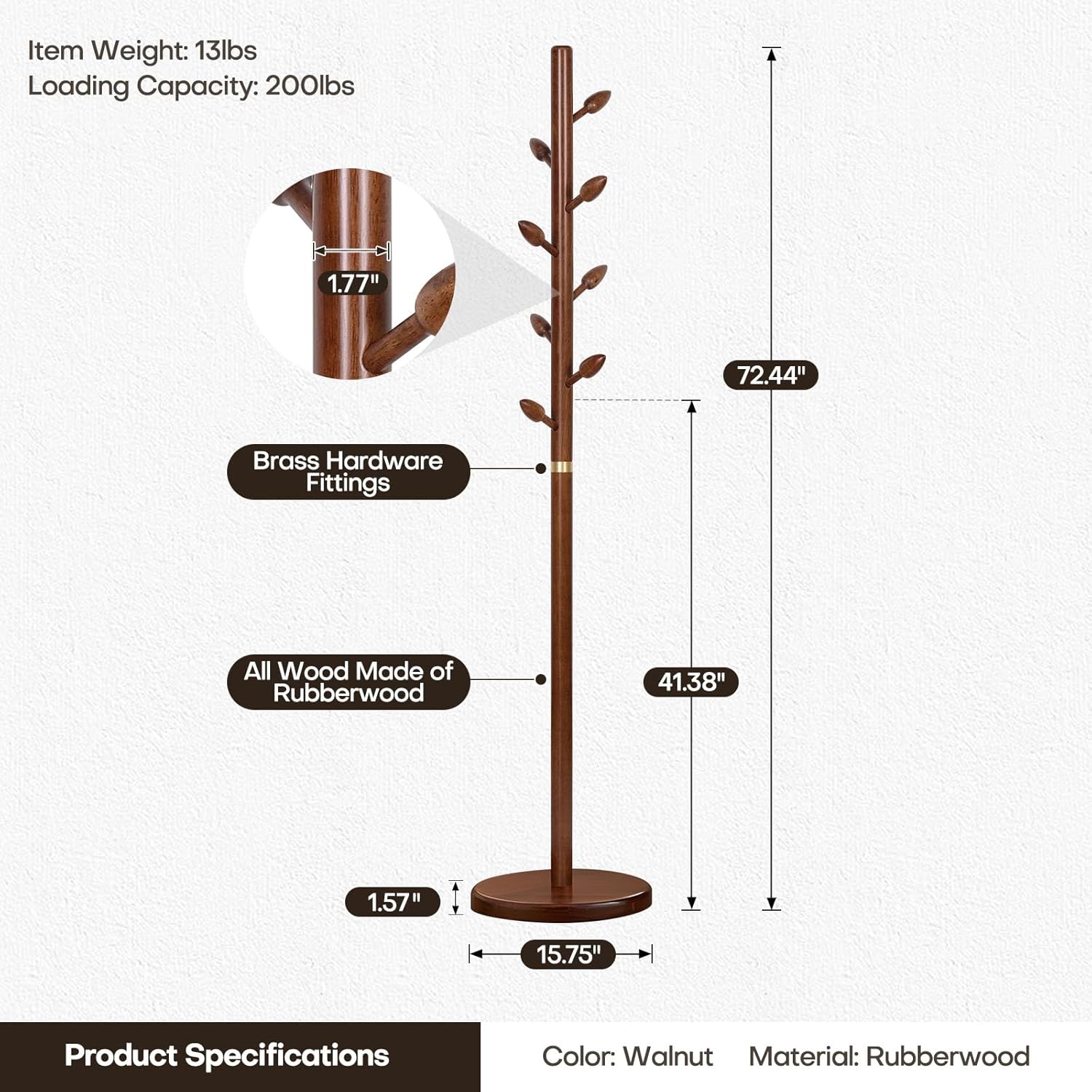 - 【Premium Quality and Durability】: Crafted from premium rubberwood, this wood coat rack is built to withstand daily use. The sturdy construction and low center of gravity ensure stability, making it wobble-free. With its distinct wood grain pattern and a refined semi-glossy finish, our clothes tree rack showcases the beauty of natural solid wood. The brass connectors add a touch of sophistication, enhancing its overall aesthetic appeal.