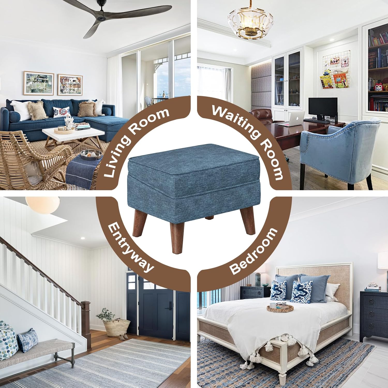 - ăDecorative Ottoman for Occasionsă High resilience foam wrapped in textured natural linen, modern style and simple appearance has a touch of casual. Wood legs with foot pads is quiet when moving, and can avoid leaving scratches on floor. Foot stool choices strive to stand out in any various occasion, such as bedroom, living room, study, lounge, balcony, dorm, entryway, hallway, etc.