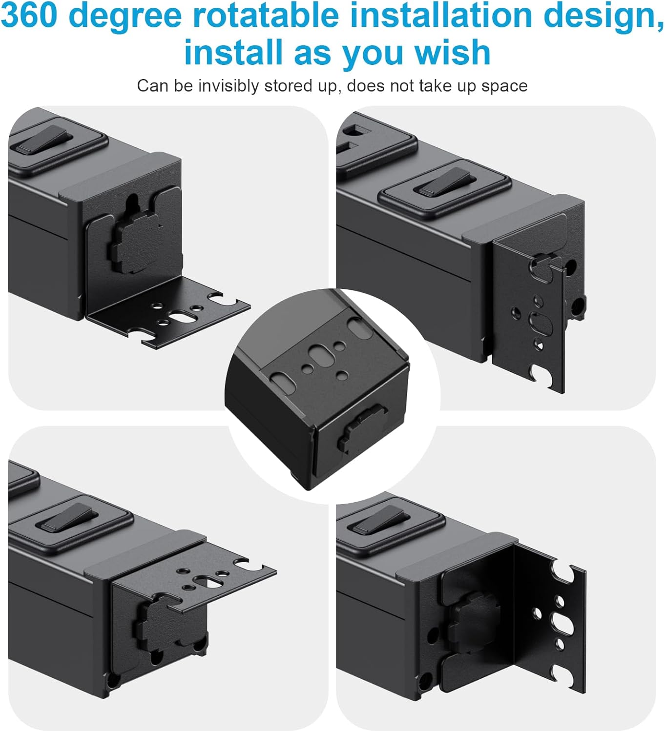 HHSOET 360° Rotating 12 Outlet Mountable Power Strip, Metal Gaming Table Mounted Outlet Strip, Heavy Duty Wall Mount Surge Protector with Switch, Works Great and Very Versatile, 15ft Power Cord.Black
